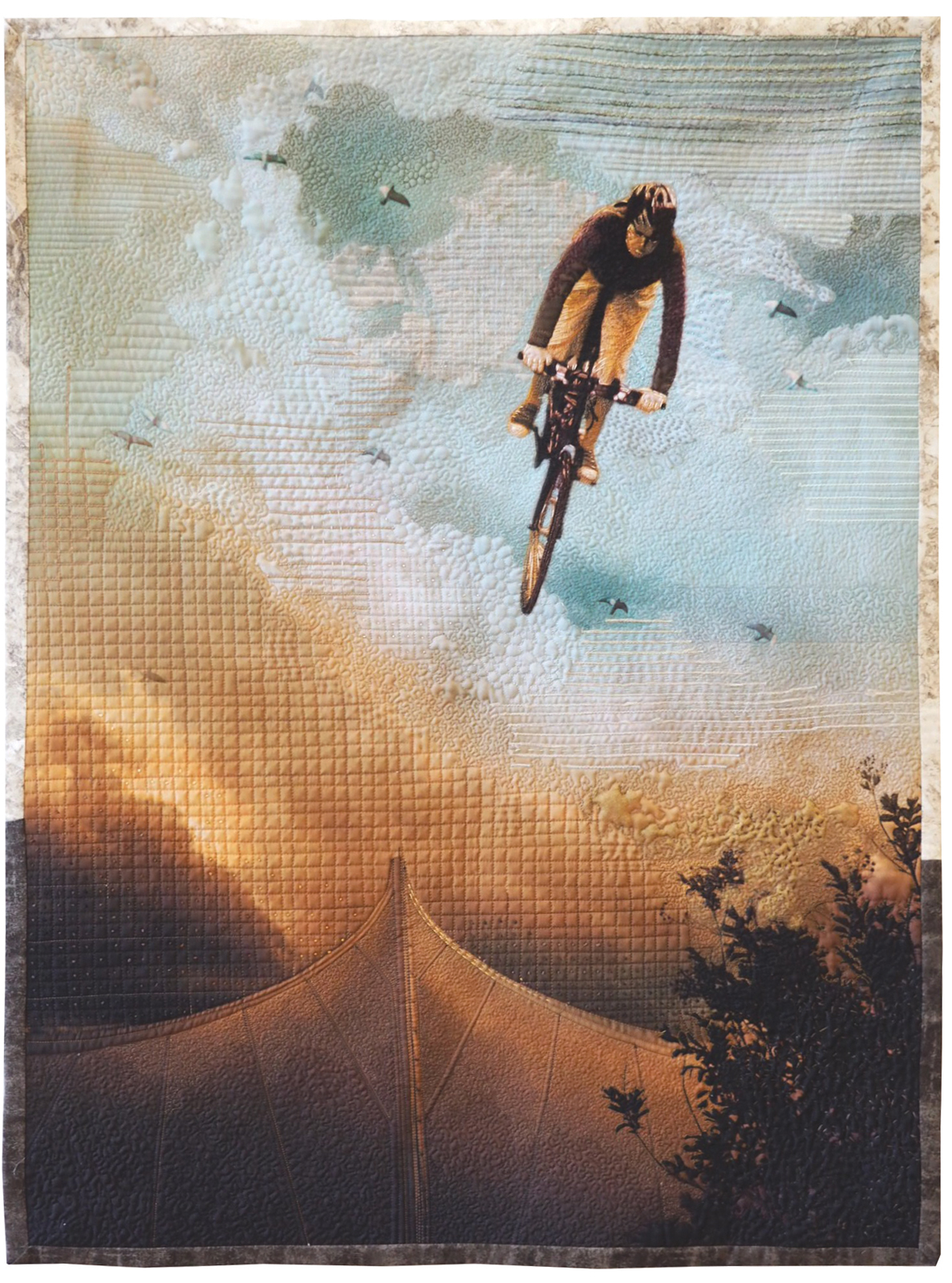 I often go to the top of a parking garage that is across from my home. It is calming to look down at the city and the people racing around beneath me. The biker in this piece was photographed from there, and combined with two other original photos, layers of fabric, and multitudes of hand and machine stitching. This process creates a surreal image that portrays the wonderful feeling I have when I dream I can fly!