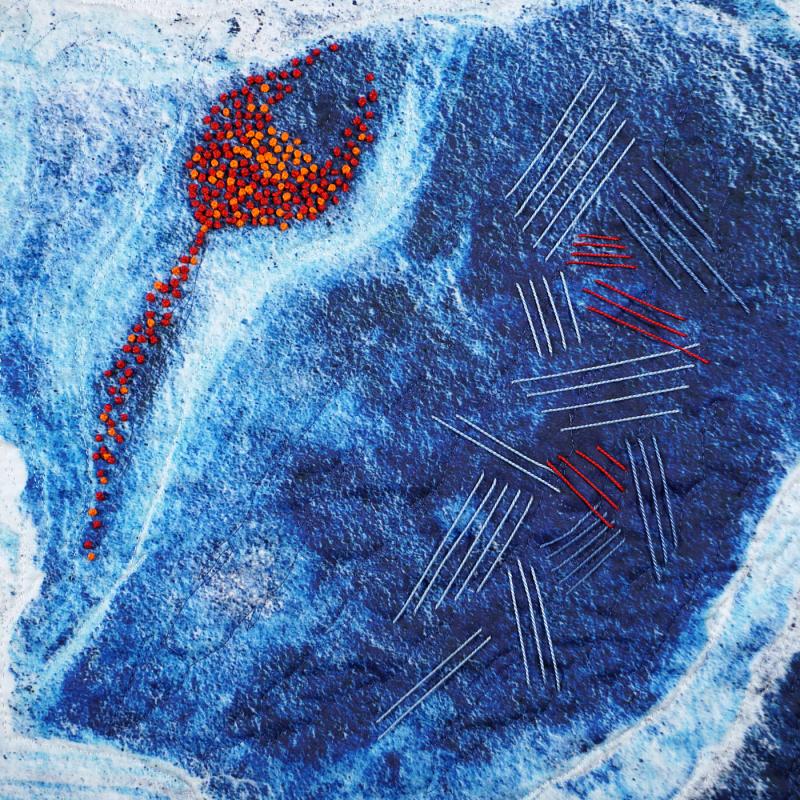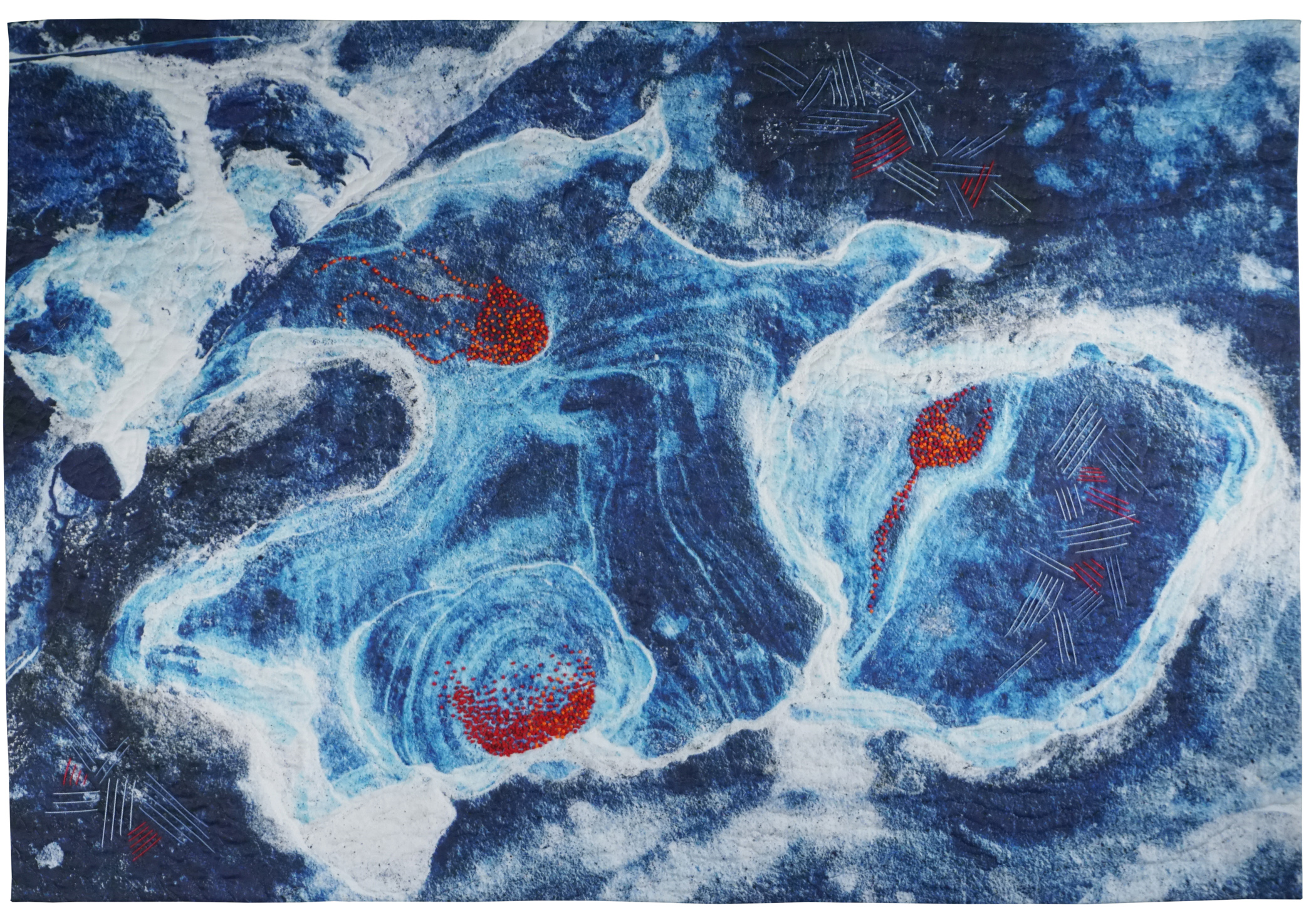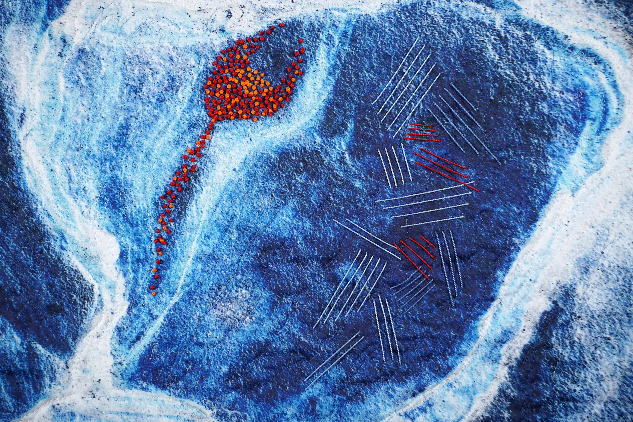 Tidal pools at the edge of the ocean depend on a wind driven inundation of seawater to replenish their nutrients and sustain the multitude of creatures that thrive there. This composition, although it uses images of rocks as its base, creates a similarly rich environment of shapes and colors that entice us in for closer examination. Through the power of computer-manipulated images and hand stitching, I have created my own world—one which evokes the richness of the earth we live on and the cycles of life that inhabit it. I hope that viewers will see the intricacies of nature’s designs in a new way.