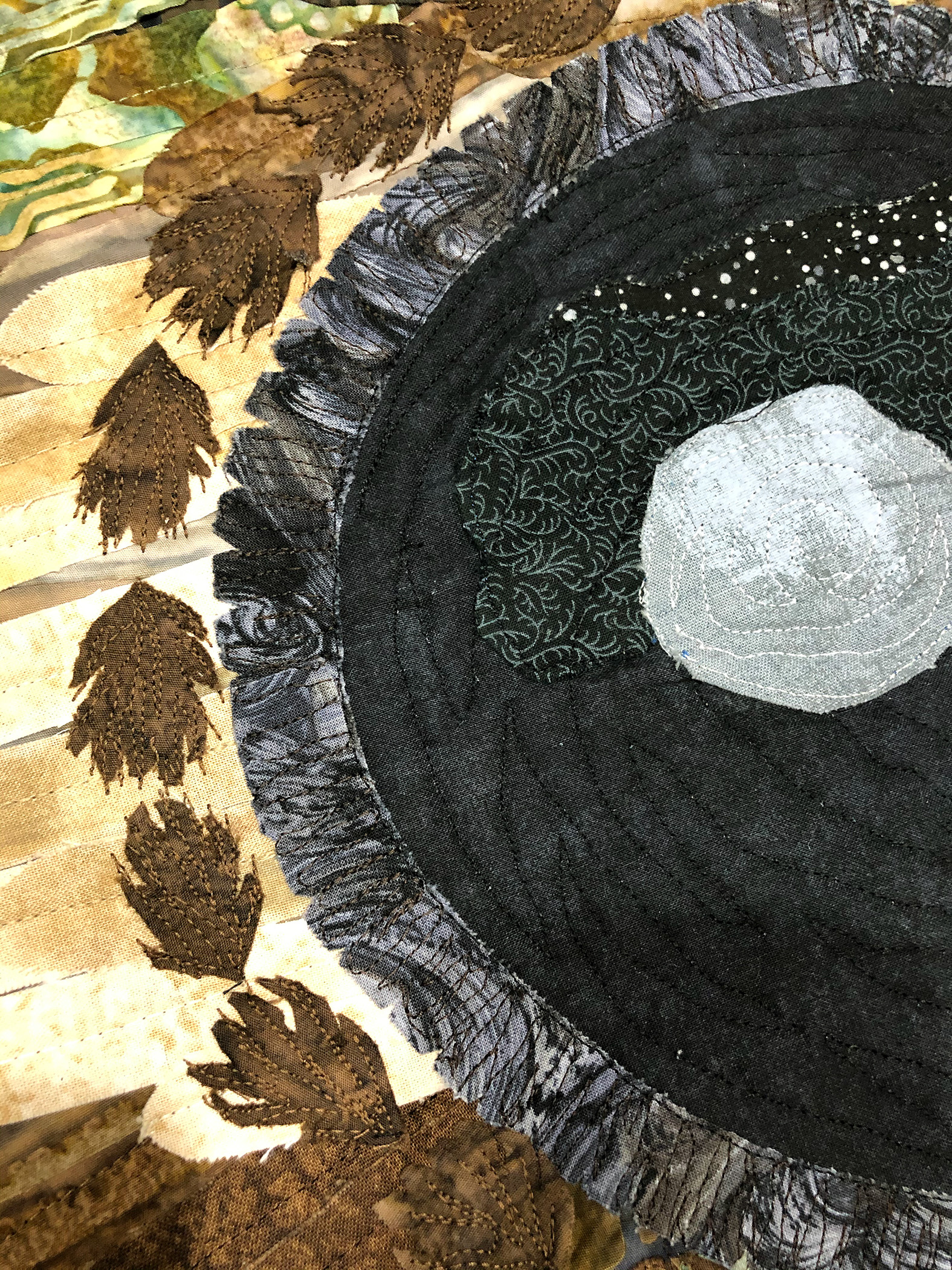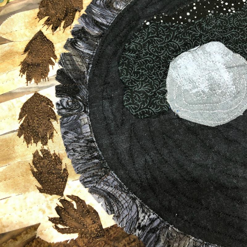My quilts tend to be nature-based. I’ve been exploring the concept of enlarging smaller images, allowing the details to be more pronounced. The tiny, broad-billed hummingbird measures about 4 1/2” in height, so I chose to scale up this bird enough that the viewer can identify it without needing to see the whole bird. Over 800 feather barbules were made in this piece.