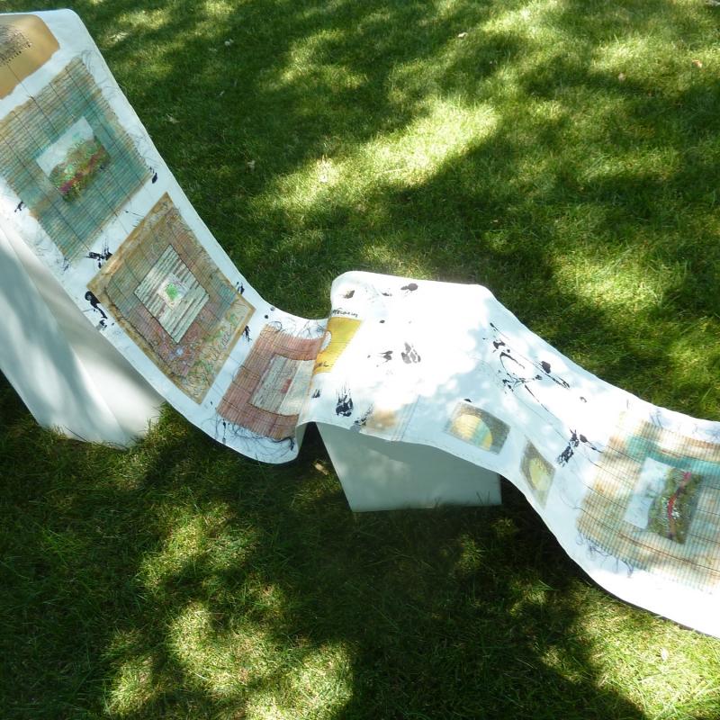 Found and recycled textiles, paper, hand and machine stitching. Found objects.