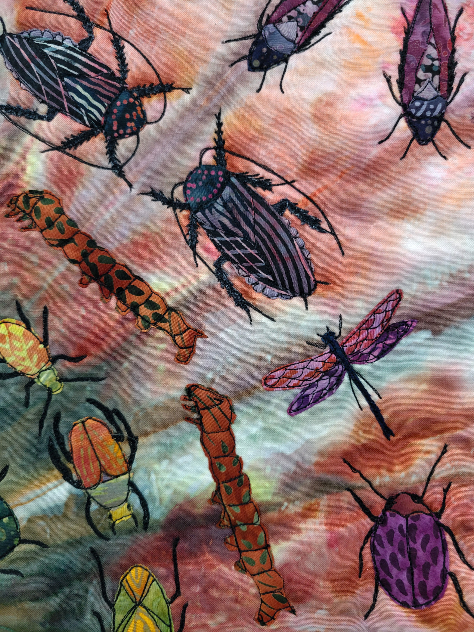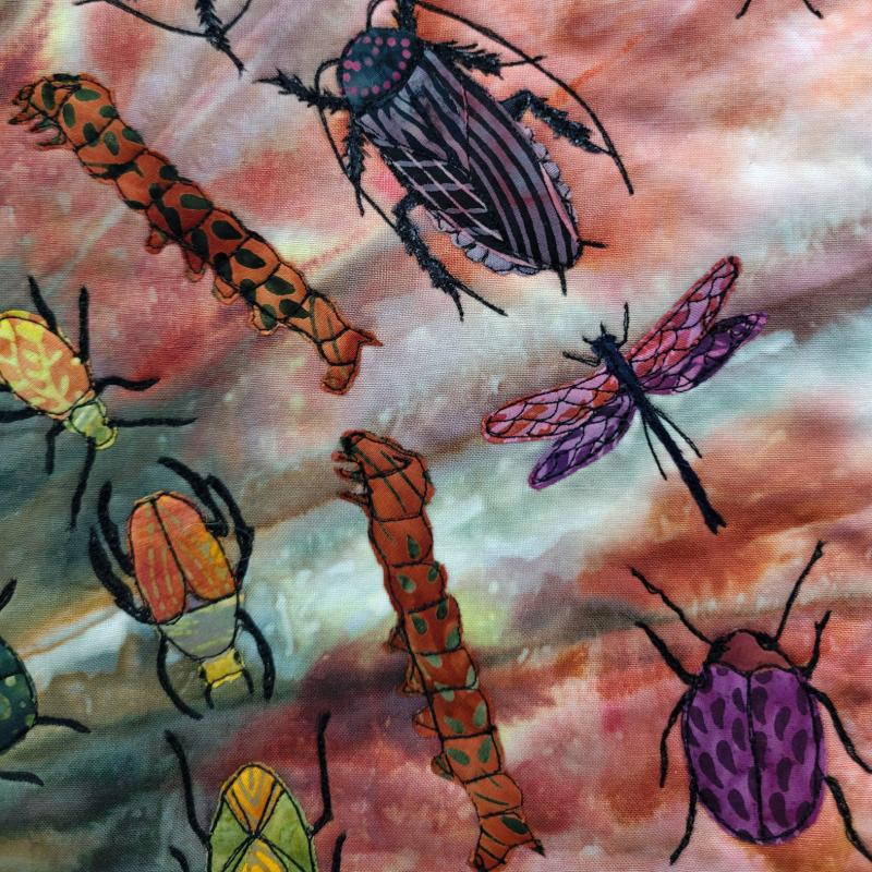 I'm fascinated by the unpredictable results created when dyeing fabric using ice. This ice-dyed mandala reminded me of the circle of life in which insects play a vital role. Here, beetles, praying mantis, ladybugs, cockroaches, caterpillars and damselflies add to the geometric nature of the mandala on which they are dancing.