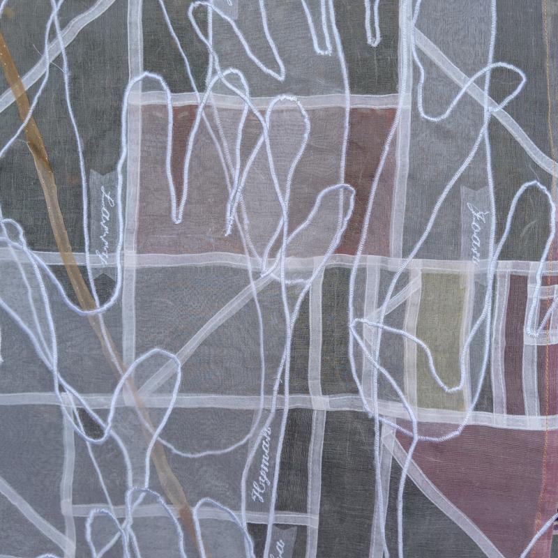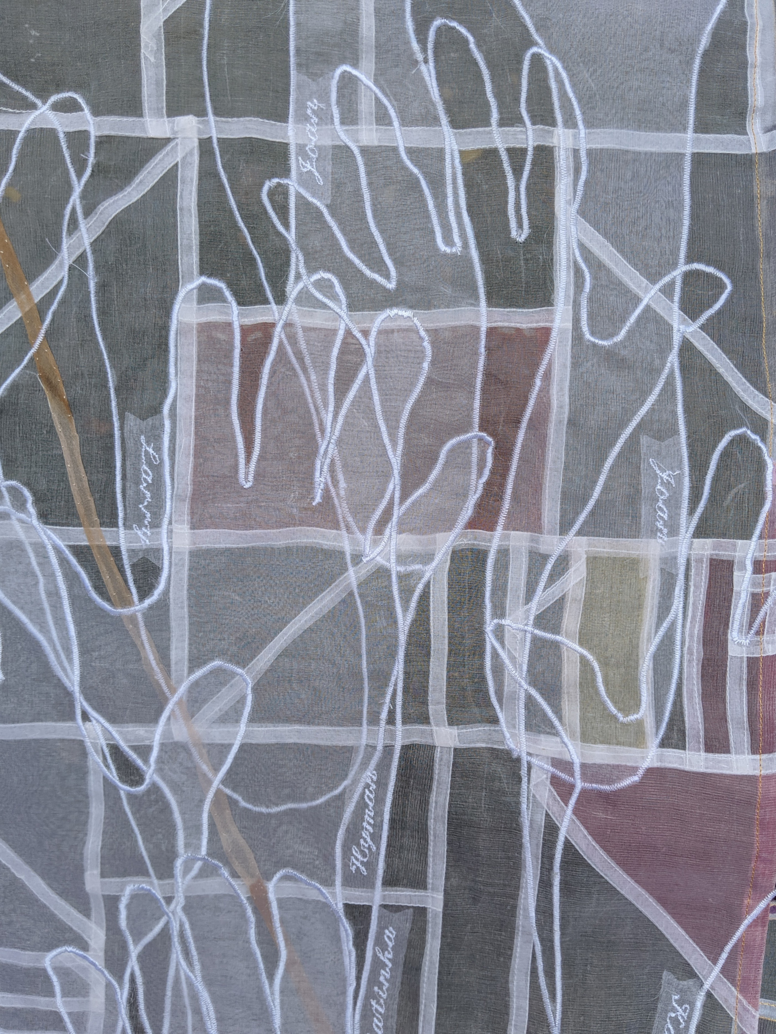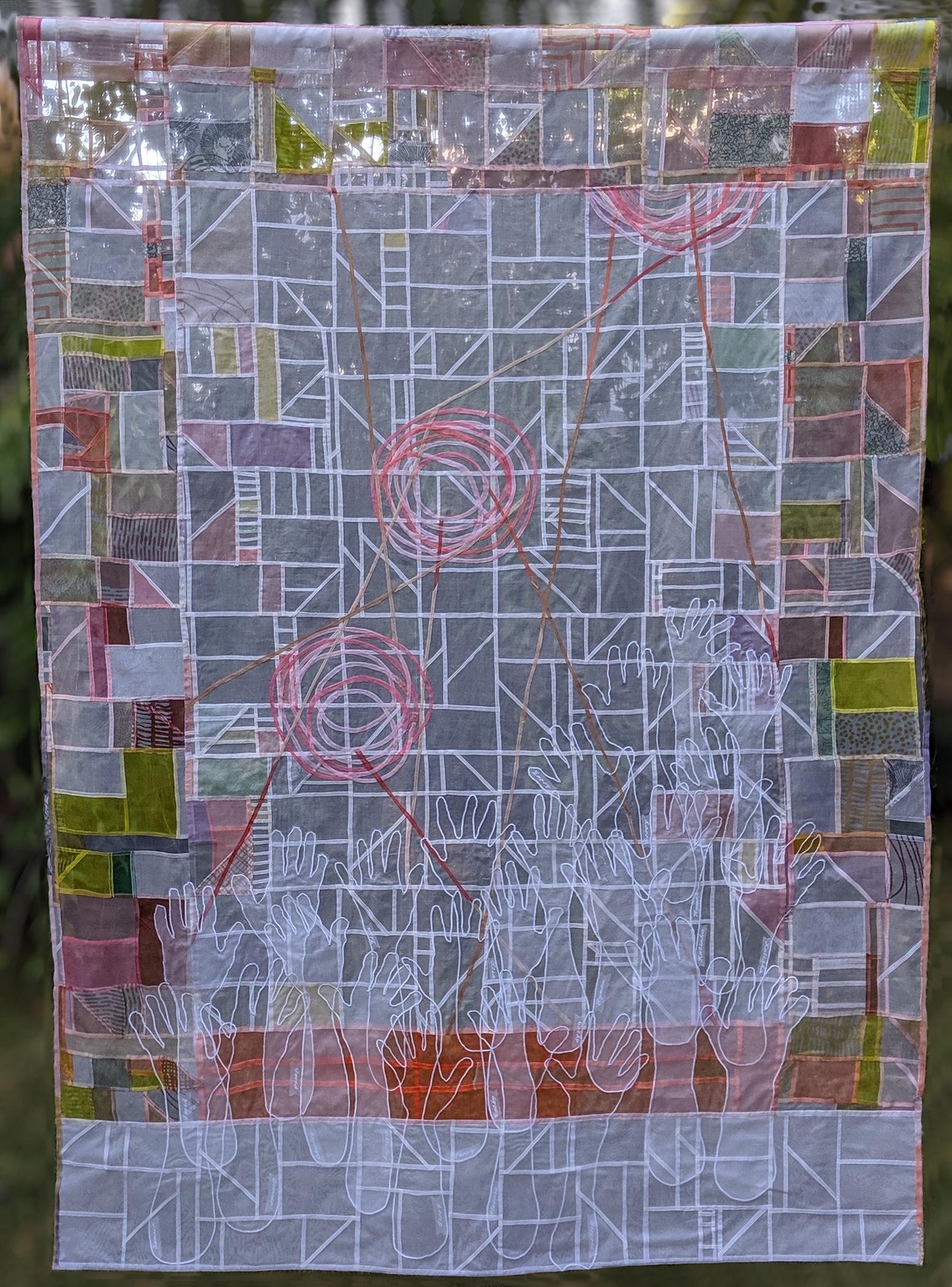 This chuppah morphed into something different when it became clear my father would not be alive for my son’s wedding. I figured out a way he could be present in spirit: together we traced his arms and hands, and after that I got drawings from family still living. The ghost white portions-the building block design and the hands-reference all early nature/nurture influences each partner brought to this union. The colored parts, dyed to a palette they picked together, reflects the couple’s new life together.