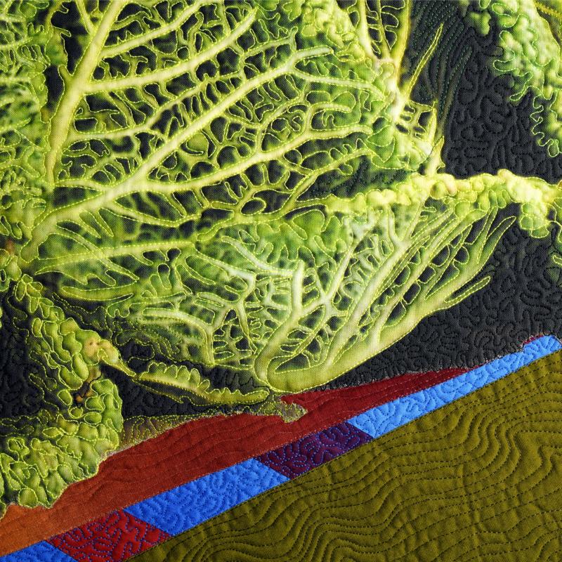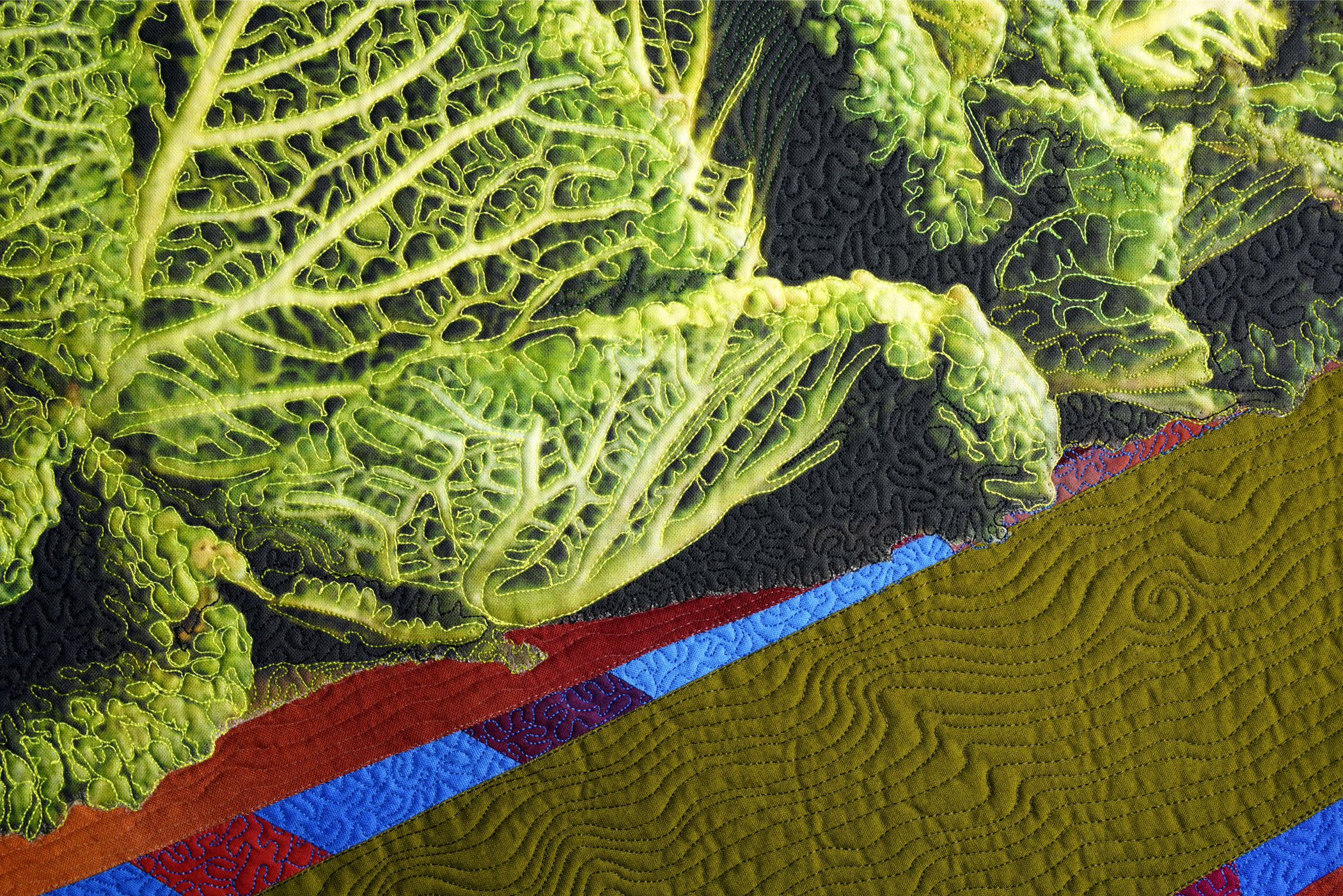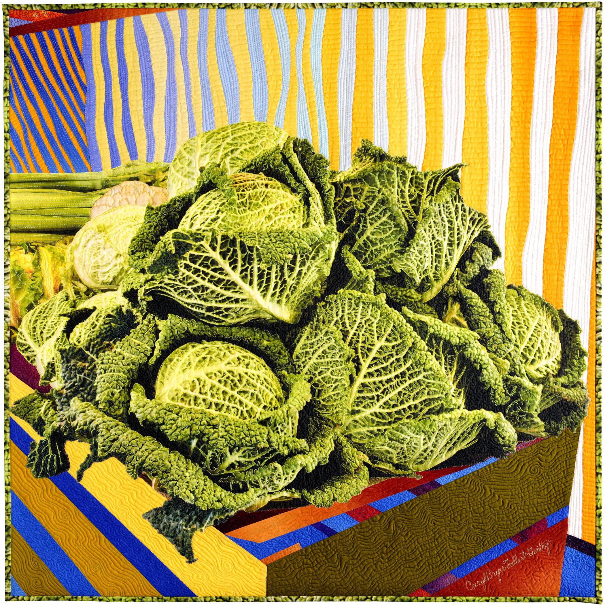 In 2009, I visited Paris and came across a wonderful farmer’s market in which all the produce was beautifully arranged. A photo of Savoy cabbages on a stack of shipping crates was one of my favorites from the trip. Ten years later, I created this design inspired by my original photo. The yellow and white curtain was abstracted into wavy stripes in intersecting gradations of yellow, white, and blue. The packing crates were also interpreted in fanciful colors. I digitally manipulated and printed the cabbage photo, which was appliquéd into the abstract background. The binding fabric was designed to match the texture of the cabbages.