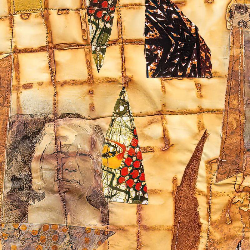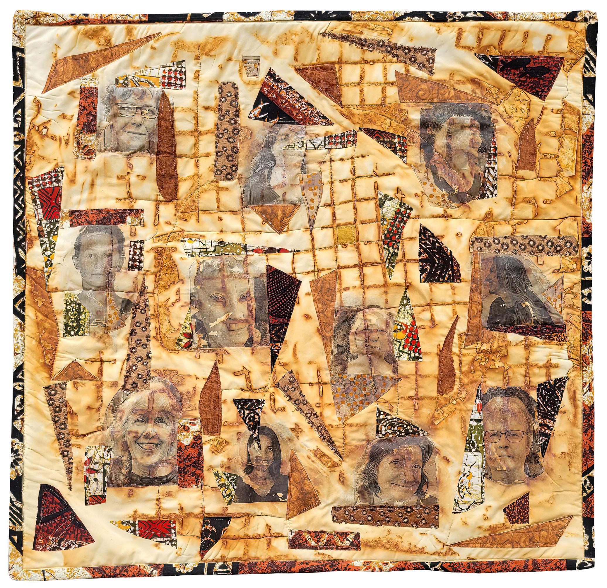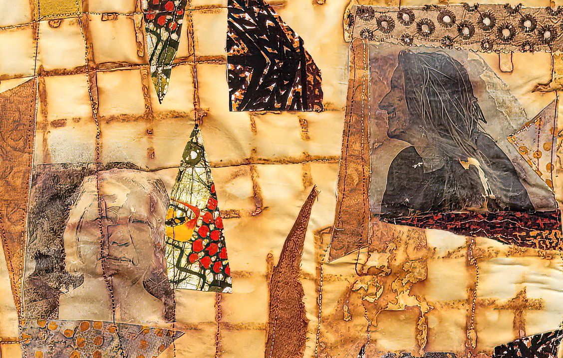 Rust dyed, photo transferred, appliquéd, free motion quilted