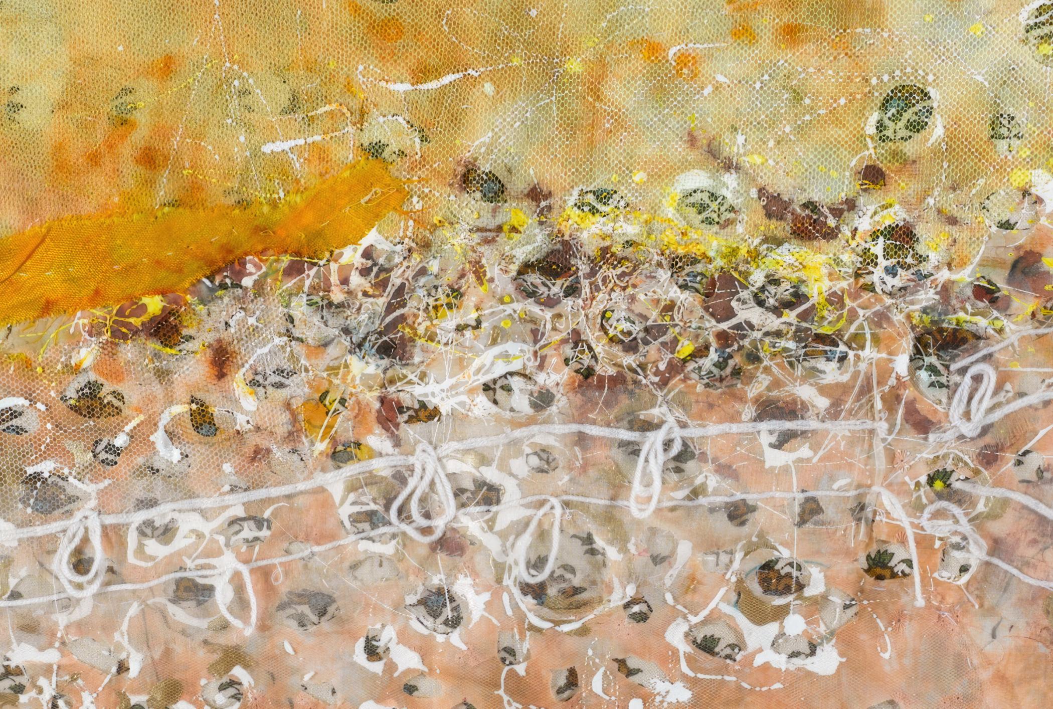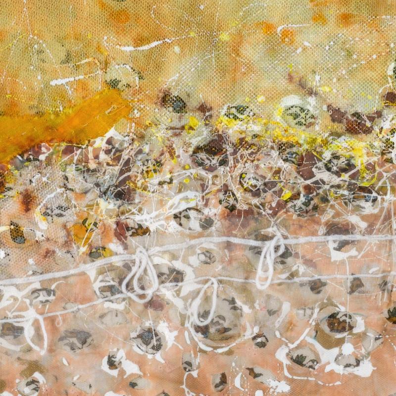 A bird's-eye view of a landscape inspired this piece. Everything seems small and unclear to the naked eye. This is a form of camouflage since from far away, small things cannot be seen. The landscape is a desert, hence the yellow and orange colors.