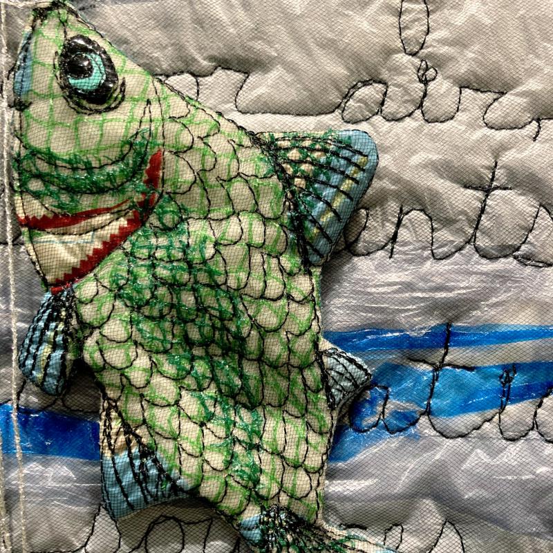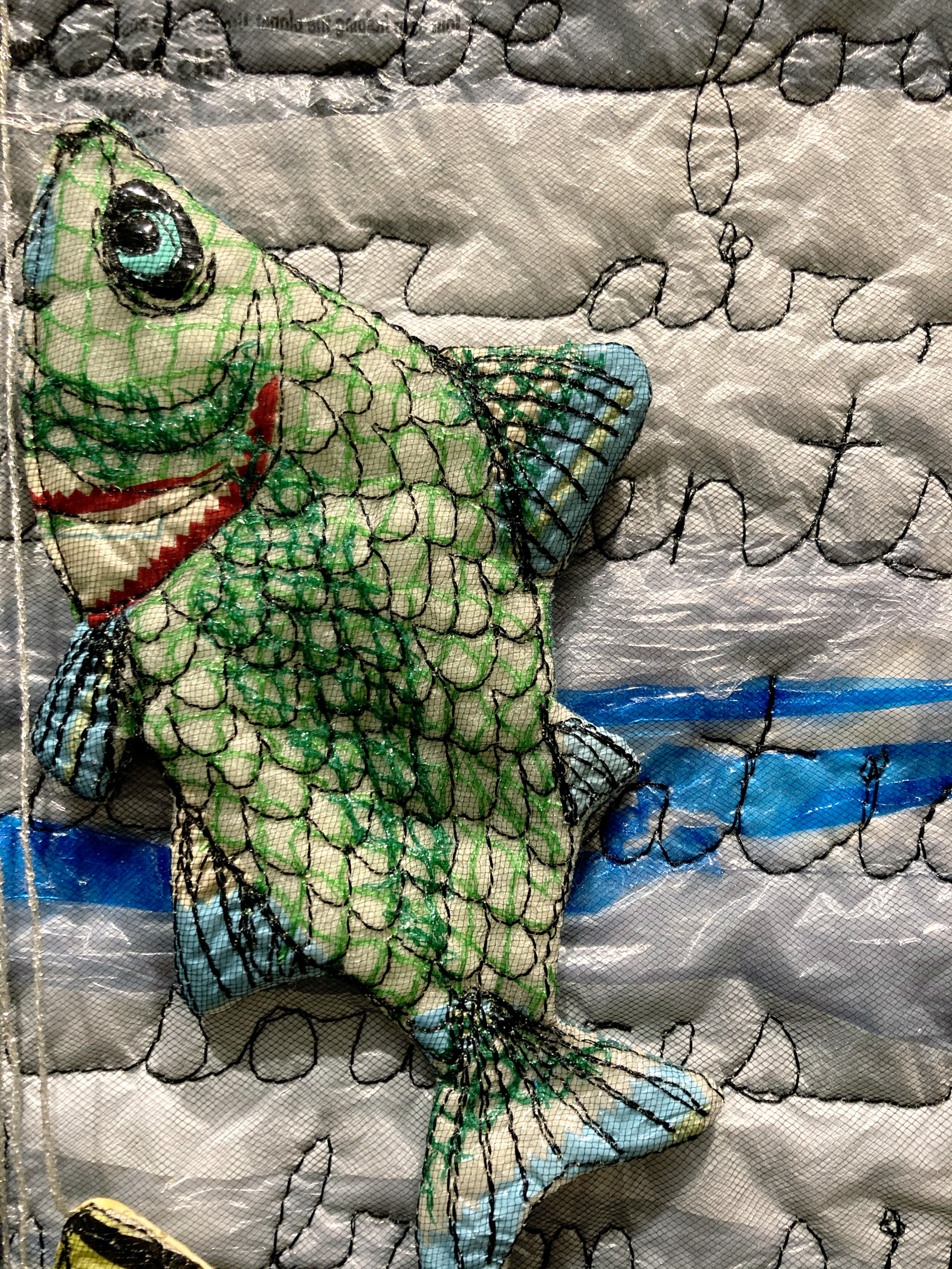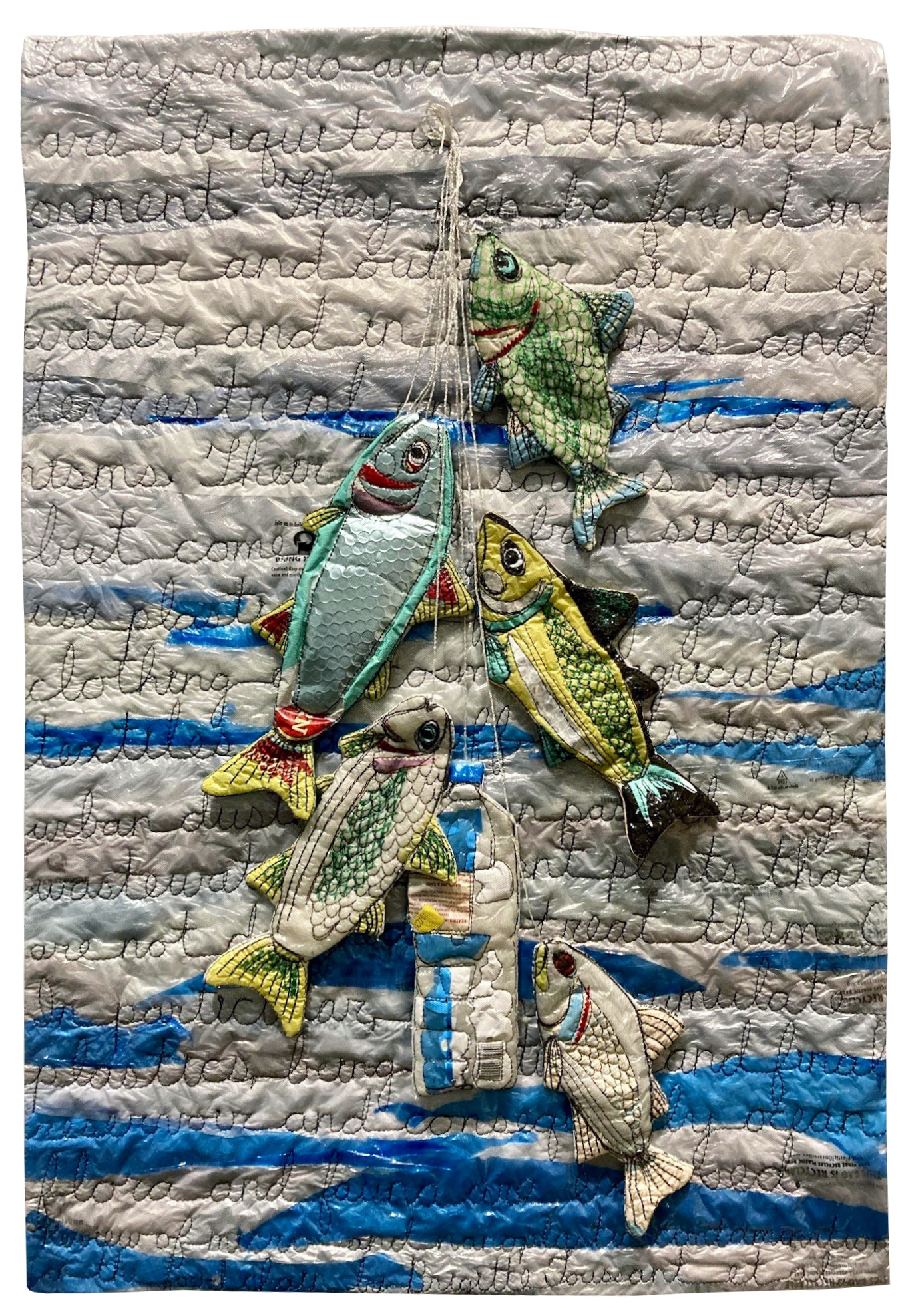 Plastic pollution is destroying our oceans. Micro and nano plastics are in the water everywhere on the planet and are ingested by both marine life and humans. Nobody knows yet what the long-term effects of this will be, but it probably won't be good. I made this quilt entirely out of recycled plastic bags from my own garbage to point out the problem and suggest a solution: we need to wean ourselves from single-use plastic. If we all reused each plastic bag once, only half as much plastic would end up in our oceans. If we can wean ourselves from purchasing water in plastic bottles that would be even better.