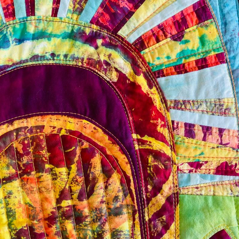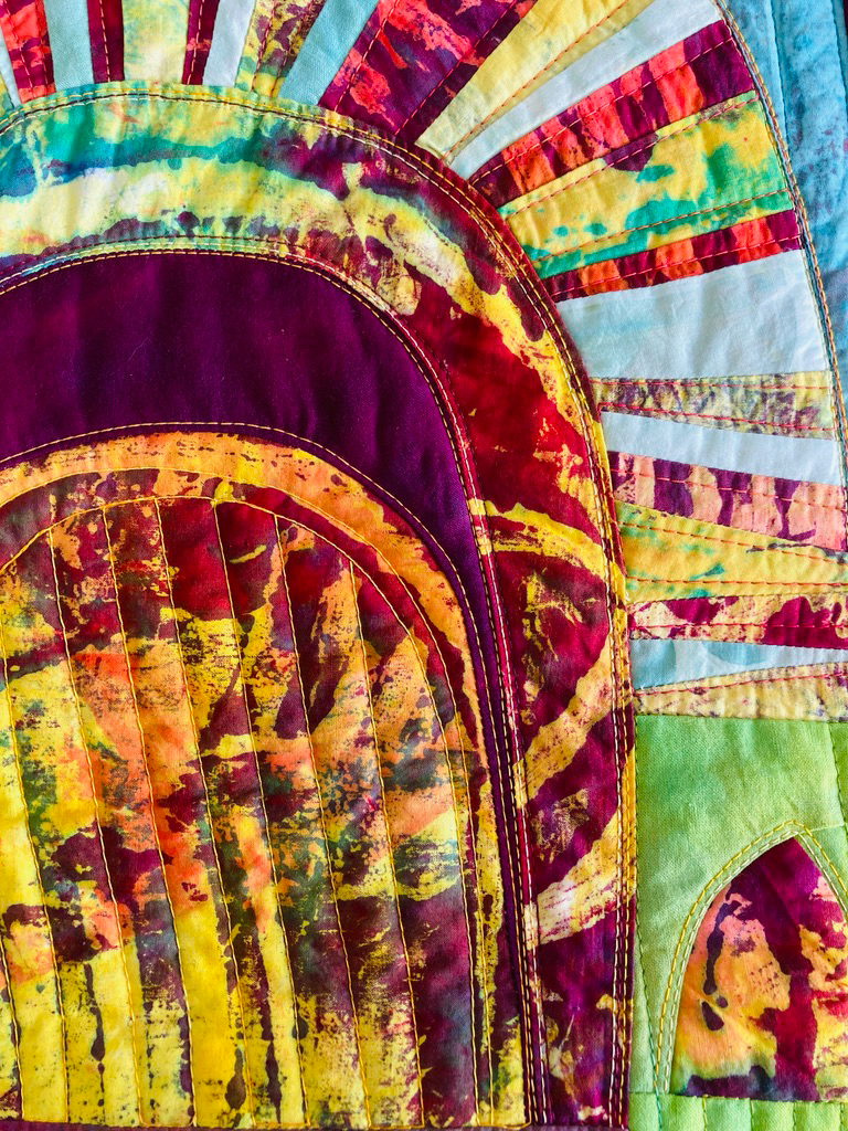This third cathedral of my series was created thinking about Nantes cathedral, which was partly destroyed by fires, the last in 2019. I was there on July 21 when it started and it gave me a huge feeling of grief: a beautiful, glorious old haven was clearly disappearing in front of our eyes. I just made a transfer of my grief into the fabrics. The screen printed fabric I used had these bright red and yellow patterns that could represent a raging fire over the roofs and behind the stained glass.