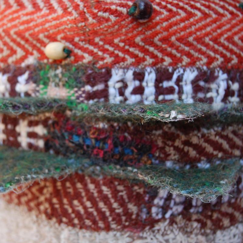 Handwoven textiles, cheesecloth, wooden beads, terracotta clay, fabric stiffener