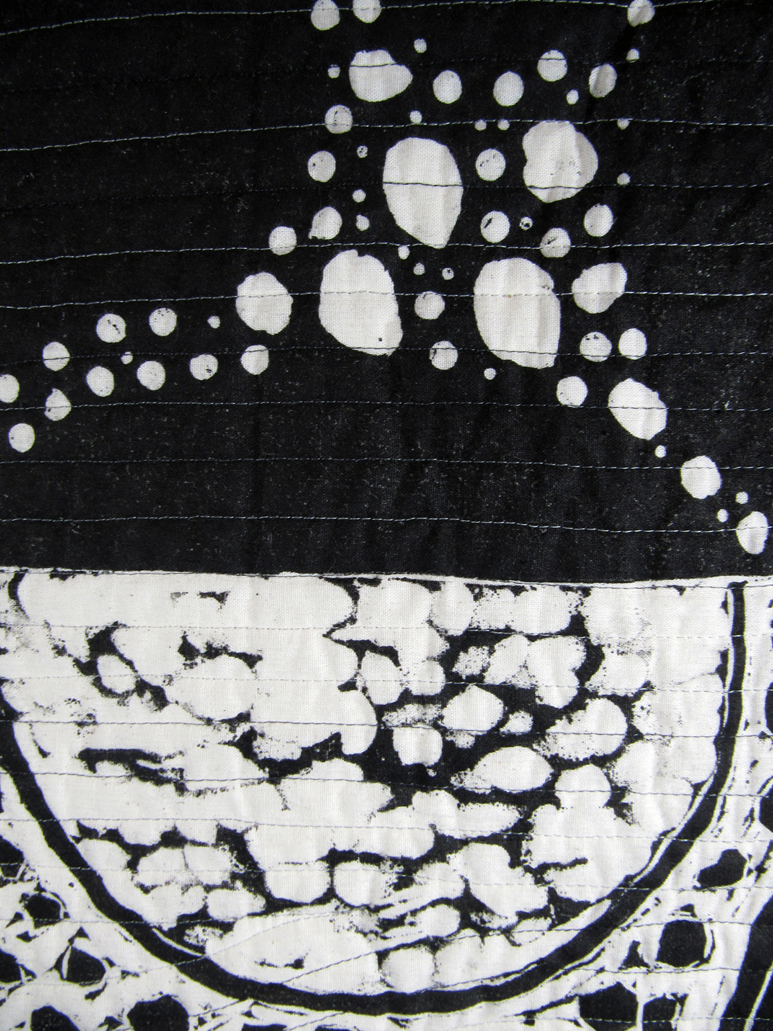 Whole cloth quilt began as a colossal woodcut that I hand-carved over an eight-week period. Printed in the street on muslin during a public steamroller-printing event. Machine-quilted.