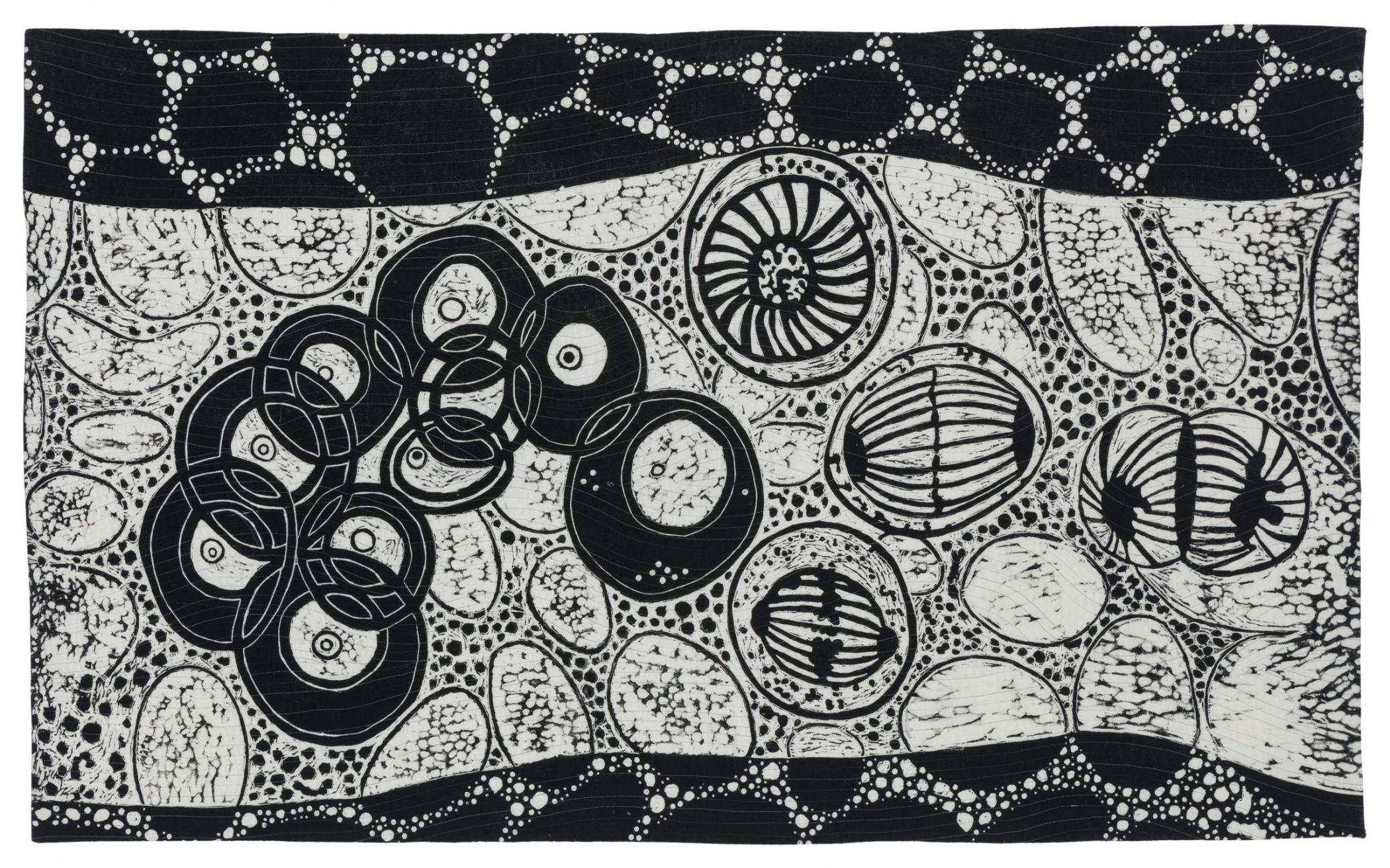 As a 9-year old, my Holy Grail of Christmas presents was a “powerful” light microscope and a dissection kit. My parents were certain that I would cut my fingers off or poke my eye out. Fortunately, I received the optics and surgical blades and many years later landed my dream job, a university teaching and research professorship in cell biology. Now that I am retired, I picked up a knife again to create a quilt inspired by the illustrations of Éduoard Van Beneden a Belgian embryologist who carried out pioneering studies of mitosis in the 19th Century.