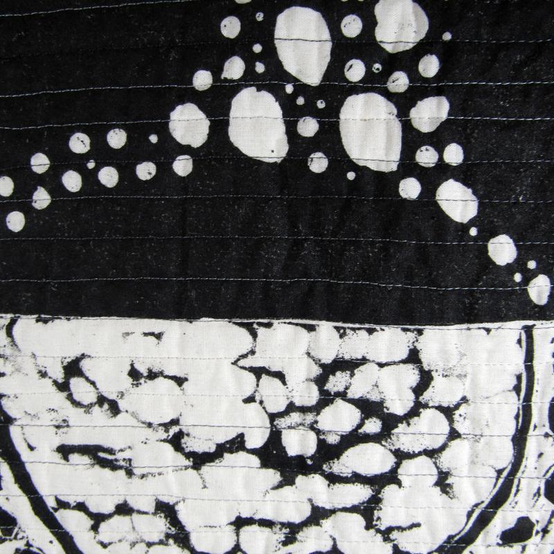 MDF board for the woodcut, oil-based printing ink, cotton fabric and thread, poly-cotton batting.
