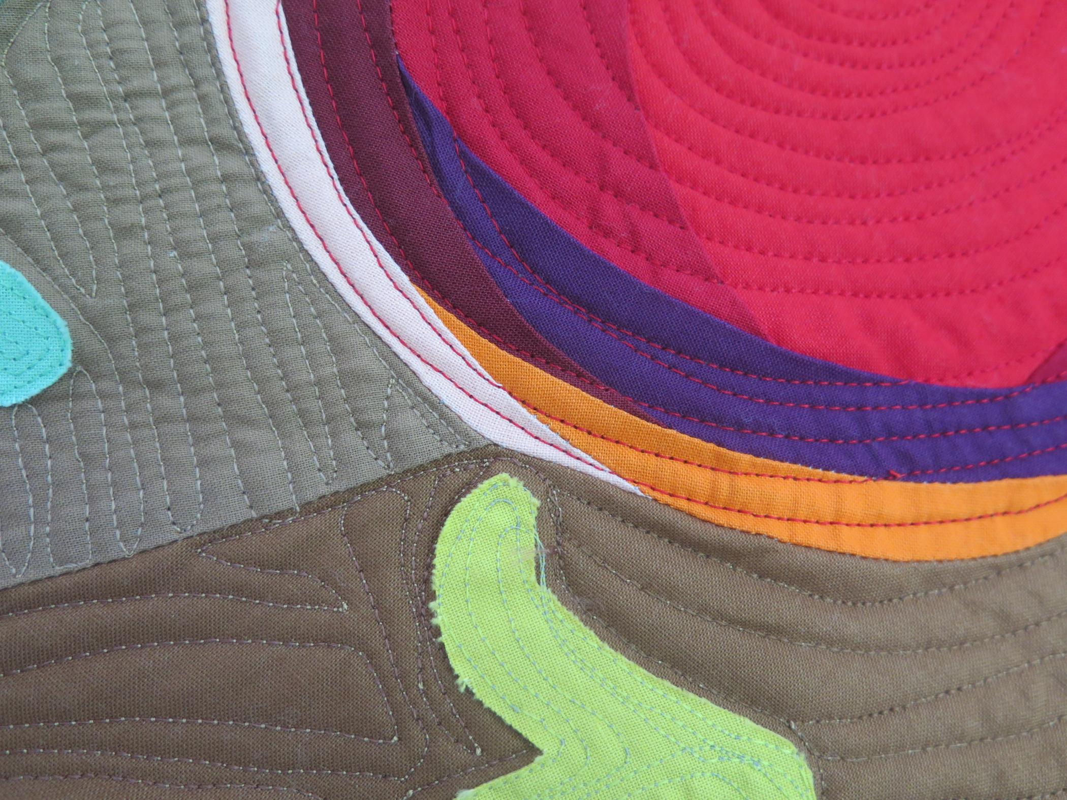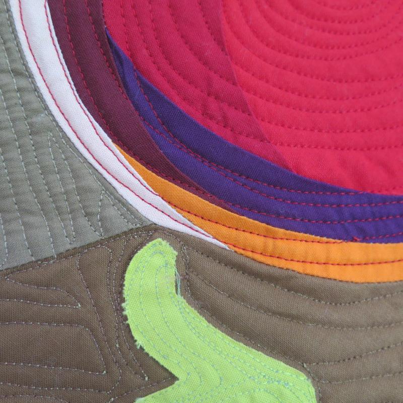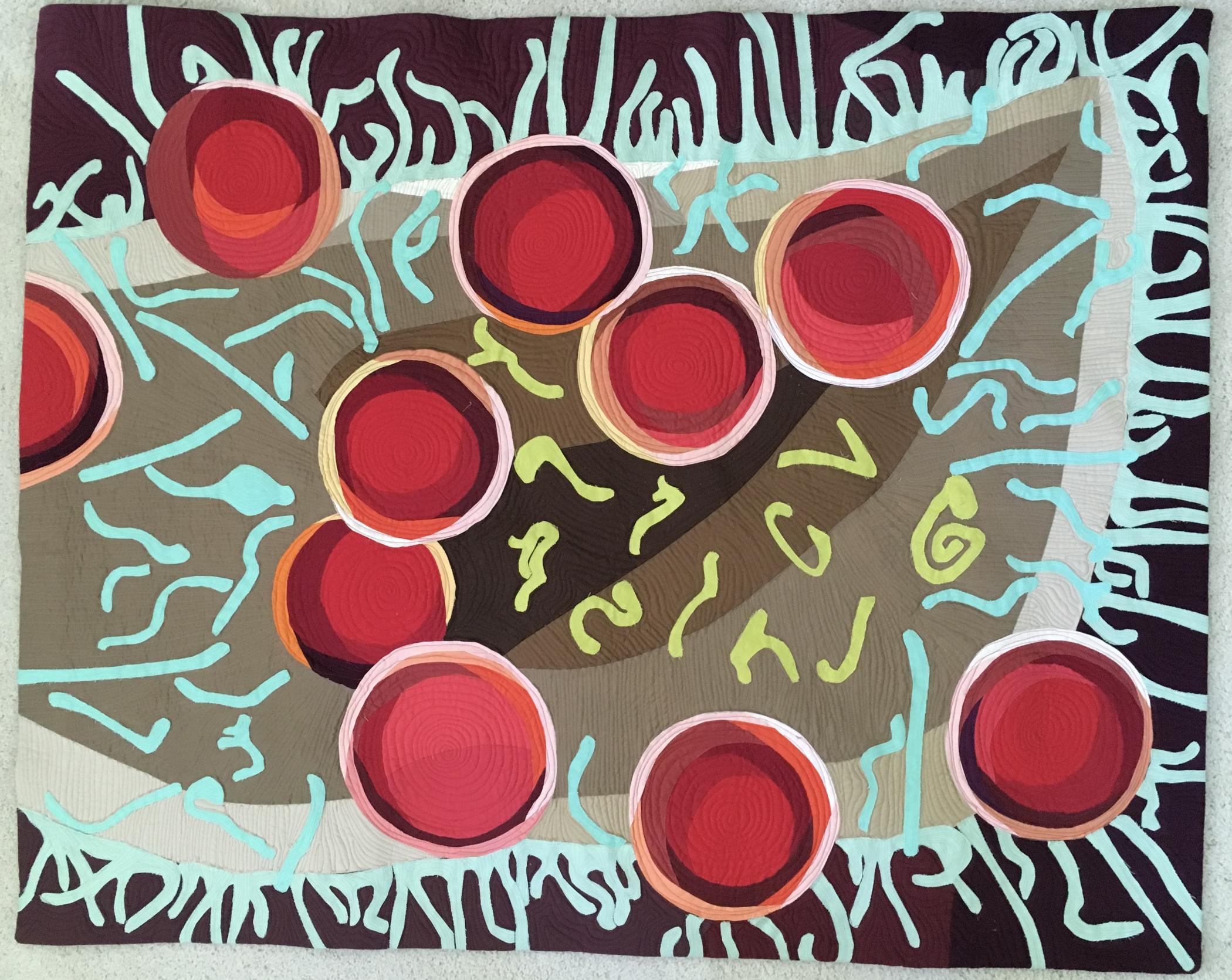 Cellular Level 1: T-cells Attacking a Breast Cancer Cell encompasses my love of science, awe of the microscopic world, and fascination with textiles. Taking something microscopic and ugly, I have transformed it into an over-sized celebration of color.