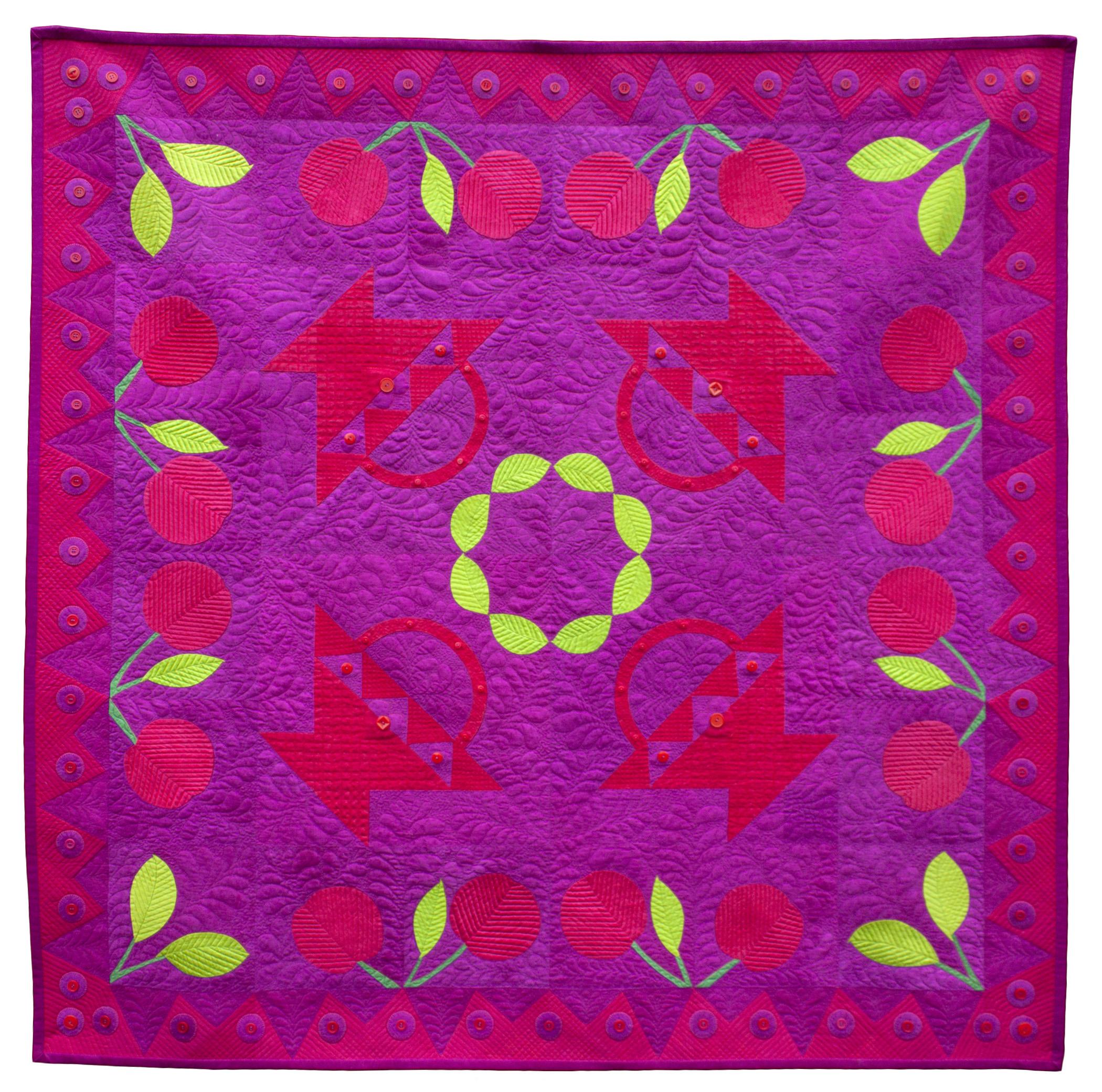 An overflowing, woven basket is a sign of social and financial success. An empty basket symbolizes disappointment, sadness and depression. I choose an overflowing basket of success. I have wanted to make a traditional basket textile for a long time and when I stumbled upon the color combination of red and magenta I knew it would work for my design By using freezer paper templates I am able to achieve beautiful curved designs in my work. I have found that working with my own hand dyed fabrics gives me the depth and vibrancy of color that lifts my soul with their intensity.