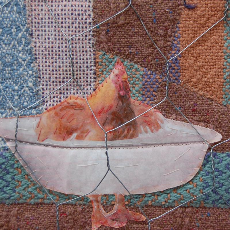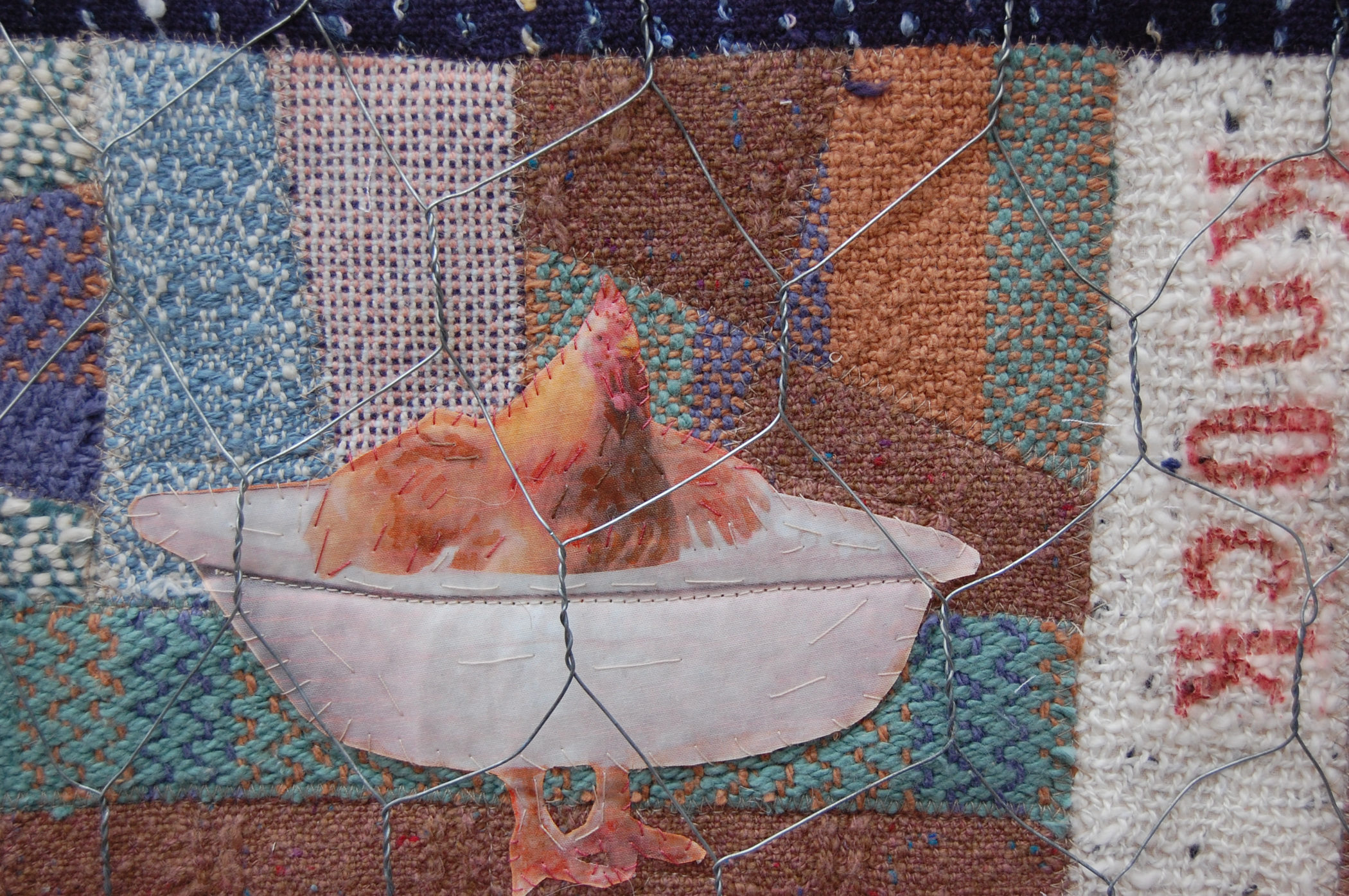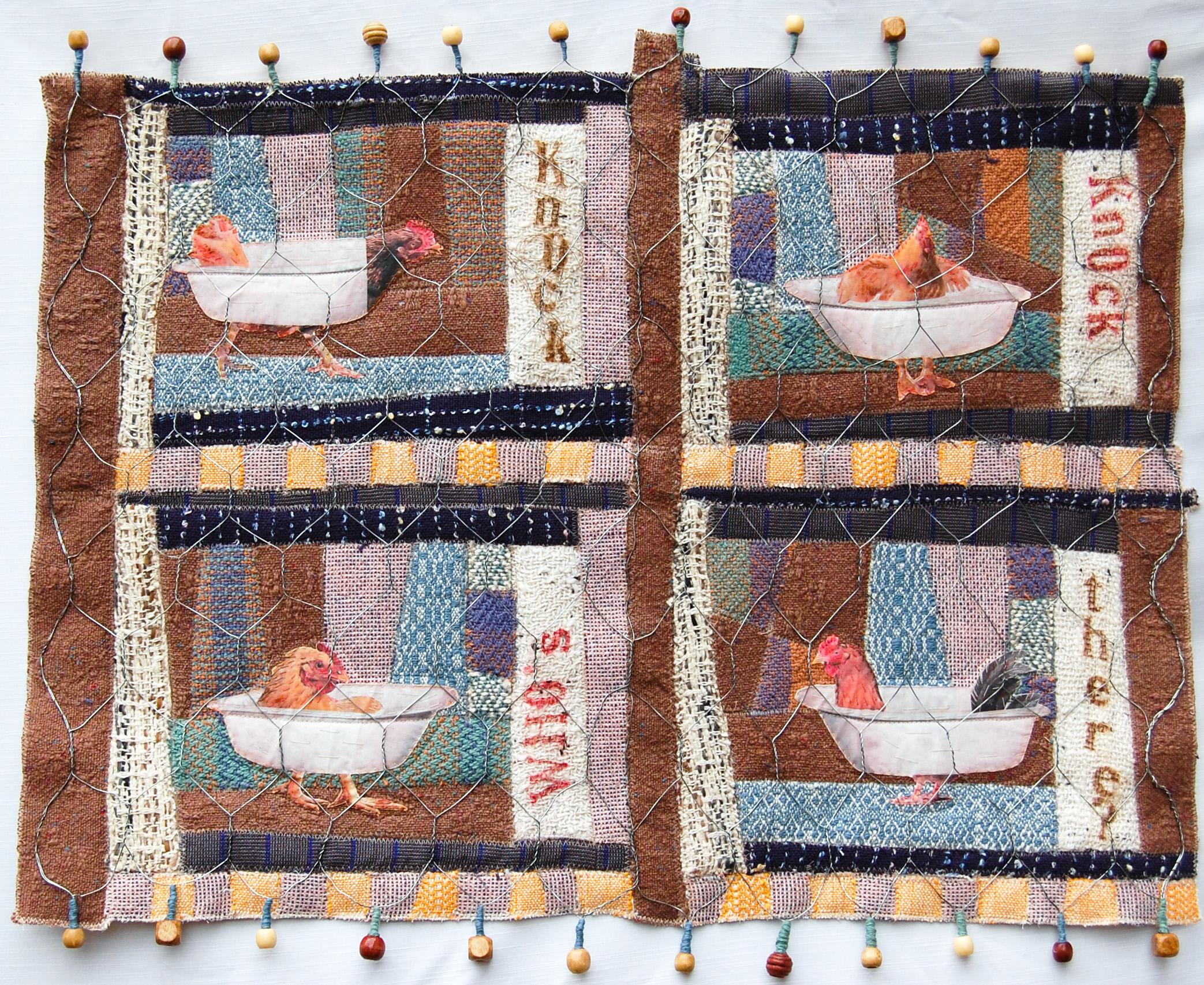 I create my art-quilts and vessels by piecing my own hand-woven fabrics. My quilted weavings are my interpretations of the lingual into visual imagery. One theme of my art has been in response to quotes from my young grandchildren with multiple implications for the viewer, such as metaphor or pun. Each work holds layers of labor, memory, and legacy. Two-years-old Zach’s first knock, knock joke told at the dinner table ended with “Chicken Bathtub!”