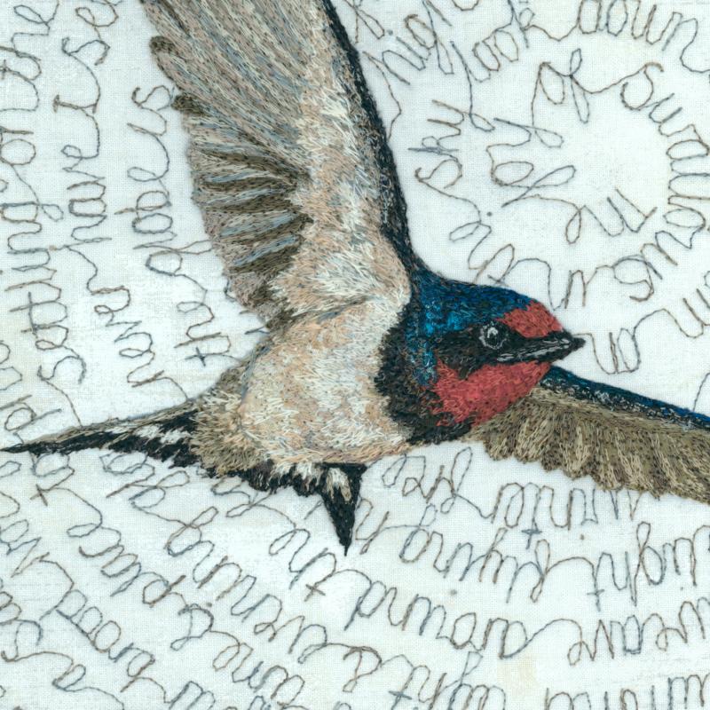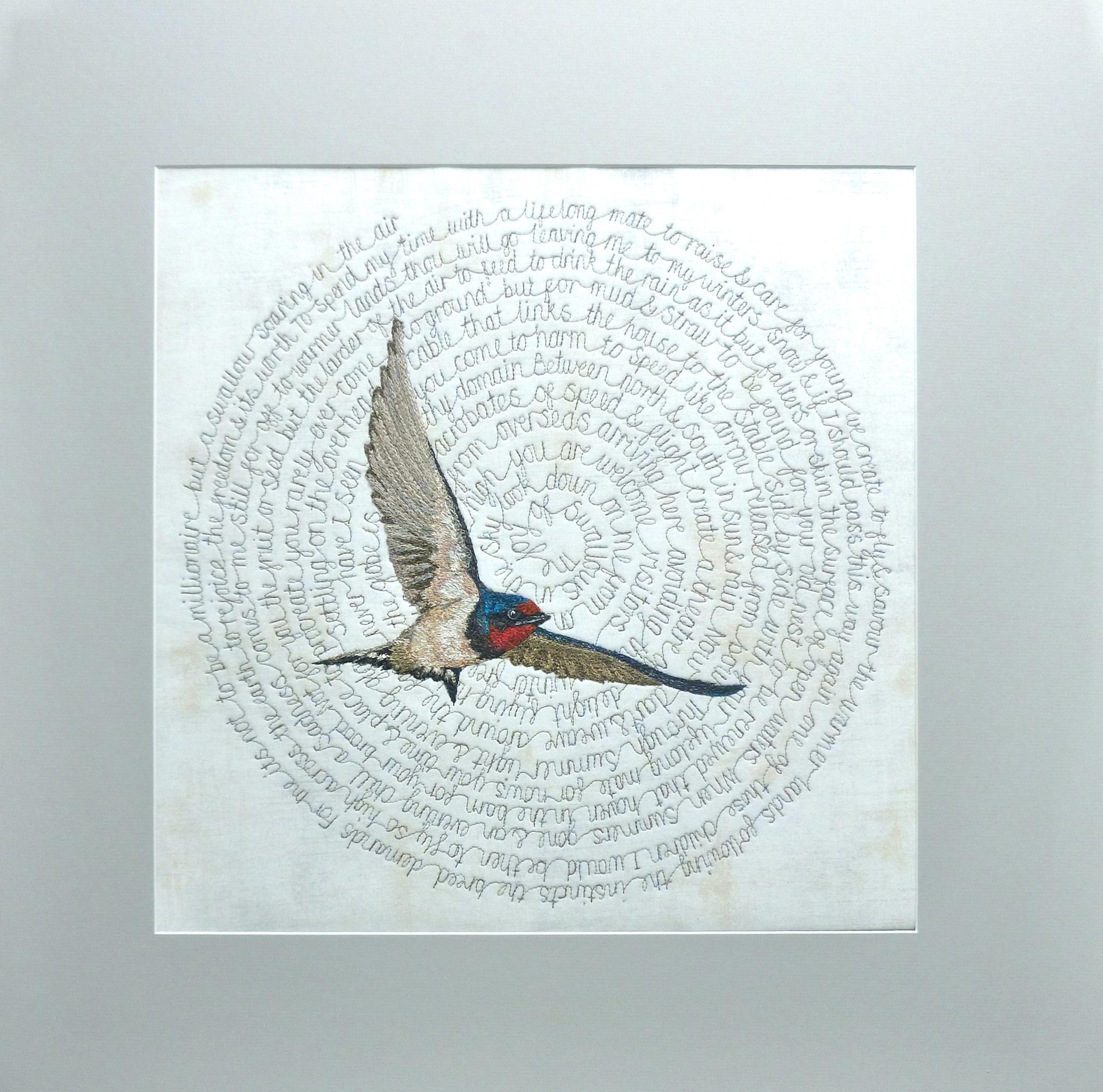 This piece is inspired by the arrival of the first swallow in spring. Their arrival each year ignites such a feeling of joy and hope that nature continues whatever else is happening in the human world. The beautiful poem 'Children of the Sky' by local farmer Mark Britten expresses this feeling perfectly. Mark has a deep understanding of the seasons and his local environment and I used his words for the backdrop of this picture, free motion stitching the words within the spiral.