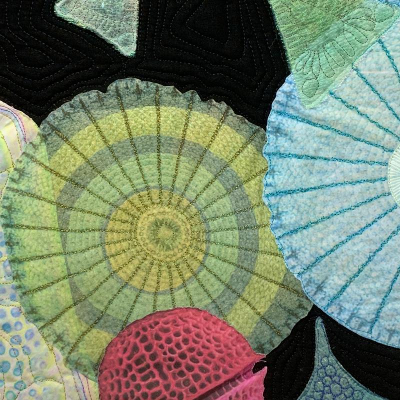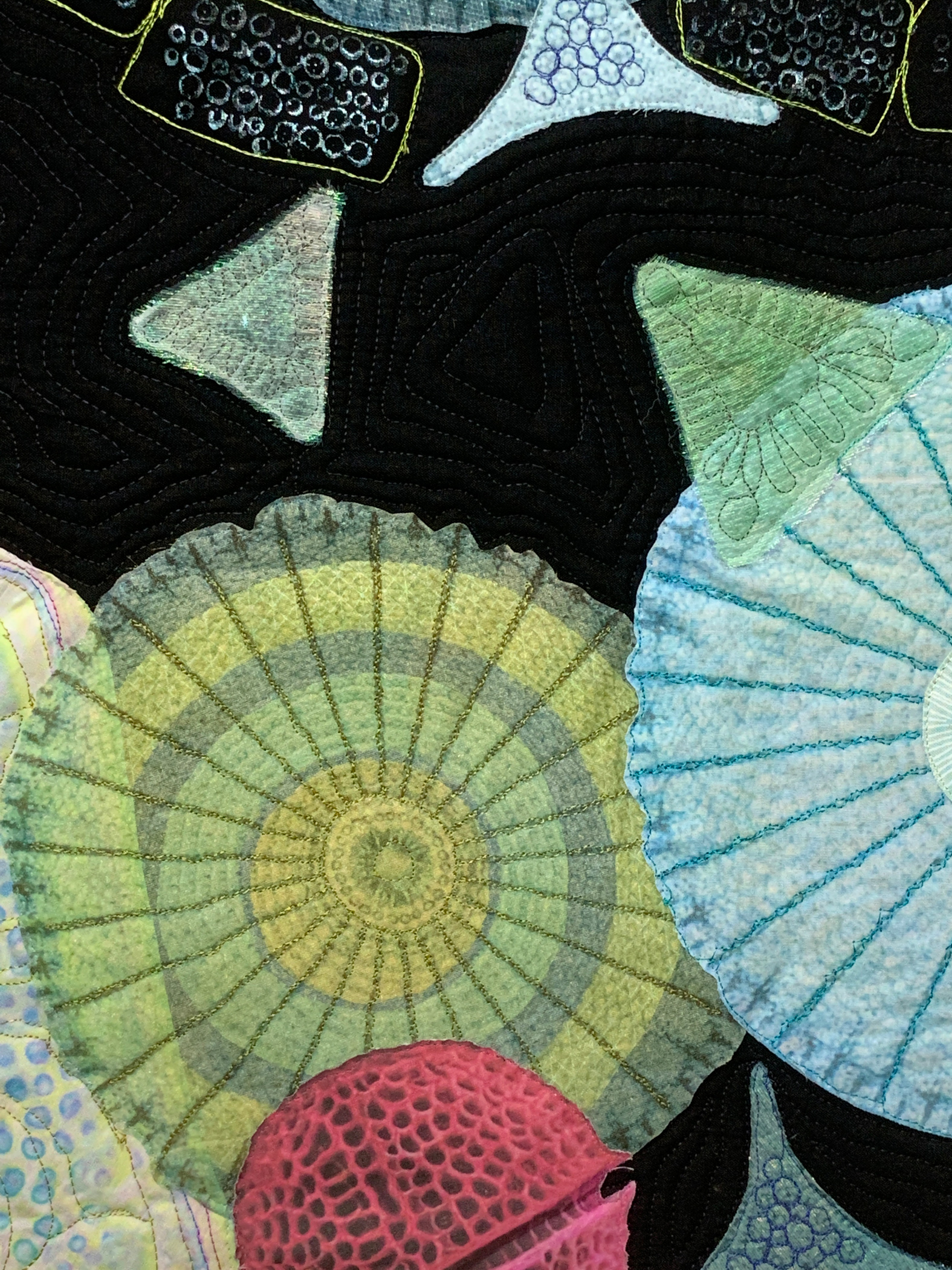 Printed, raw-edge and fusible appliquéd, stamped, free motion quilted
