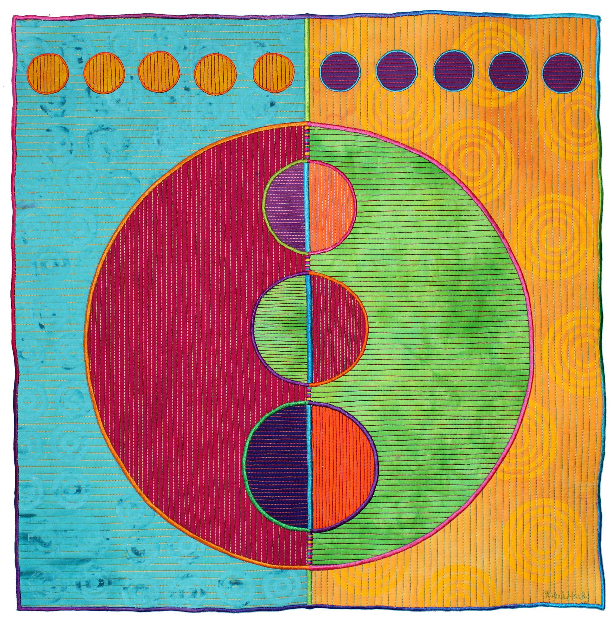 I love color. And lines. And shapes. And fabric. And dye. And thread. Portraying simple shapes at different scales, overlaying and overlapping, and using vibrant color and contrast, I create a new world of abstract forms that combine to make a whole.