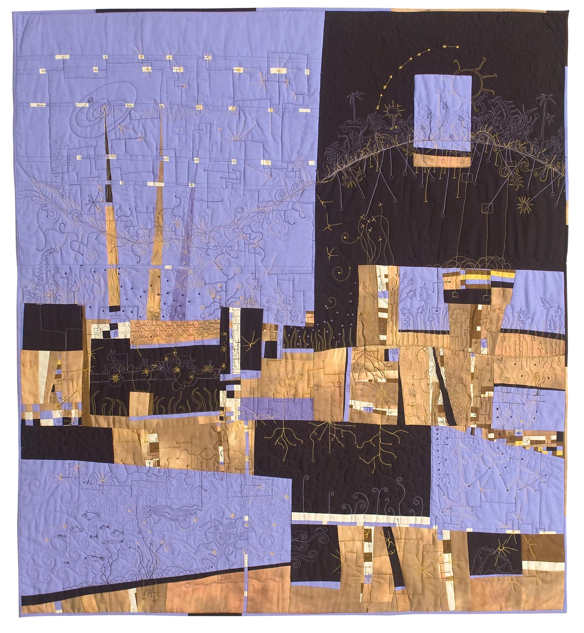 Browse the Collection City Paula Kovarik Size 41.5 in x 38 in (105 cm x 97 cm) Gallery Violet (SAQA Seminar 2021: Unit 6) Price $0.00 Buy Now >> My work is about communication. This piece was one of the first that studied the invisible networks of communications that surround us. Materials commercial cottons, cotton thread, cotton batting Techniques Free-motion and hand stitching, piecing