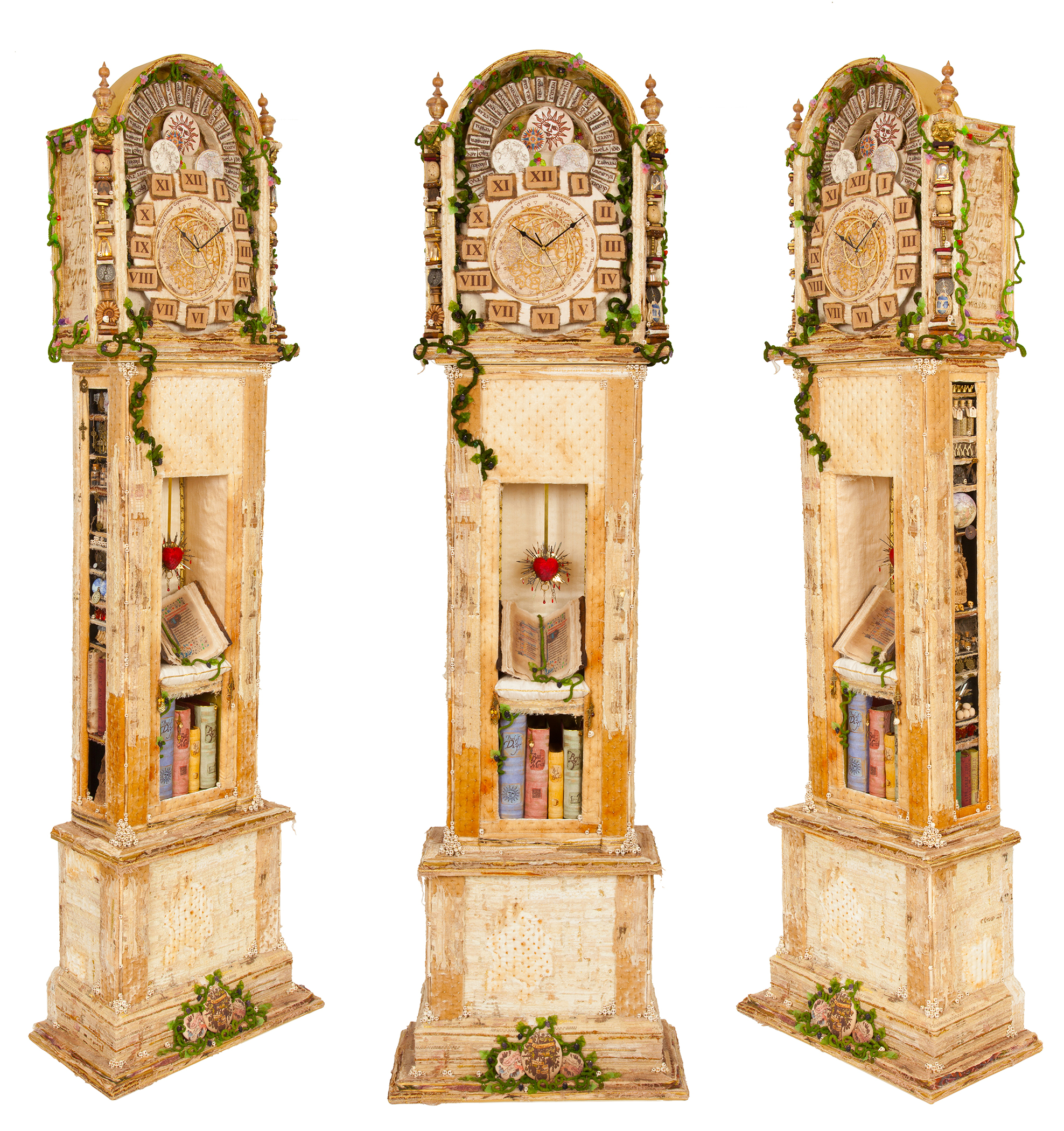 The sides are full of made and found objects, tiny bottles containing messages and other found oddments surmounted by hand and machine embroiderd lettering. The front panel has a hand made embroidered book, jewellery tassels and a working pendulum made of a quilted heart surrounded by old clock hands.