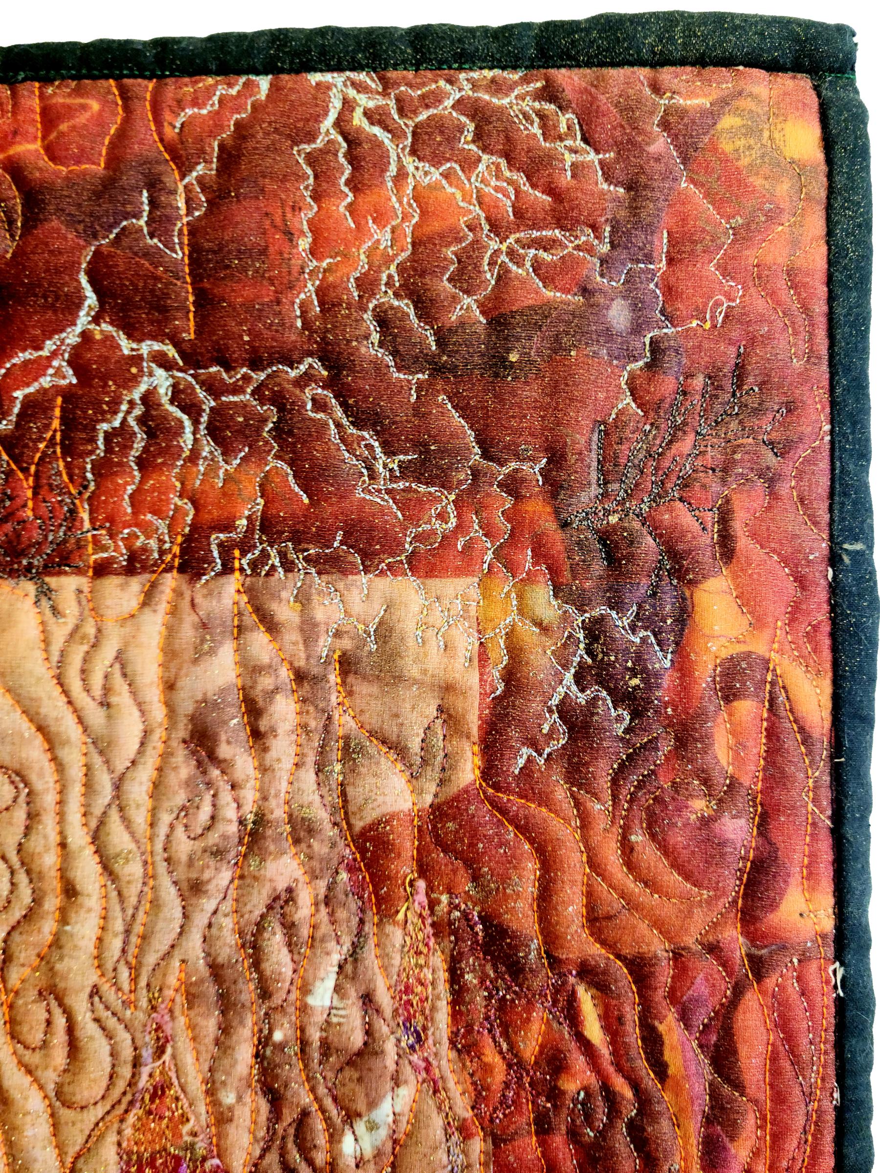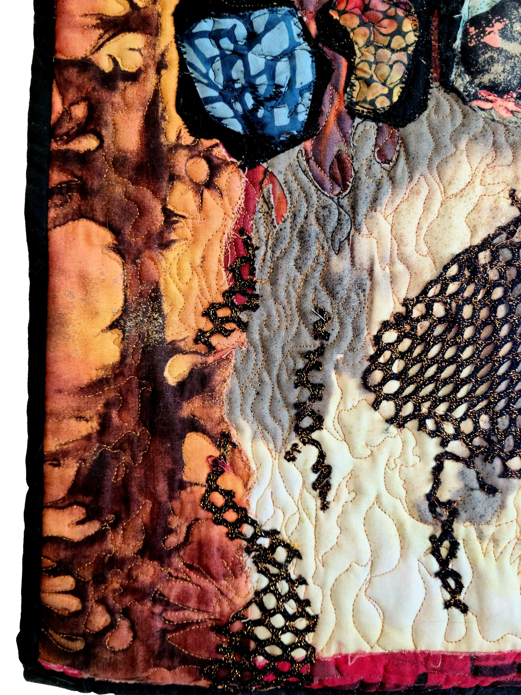 Collaged, raw edge appliquéd, thread painted, ink jet printed, layered, batiked, quilted