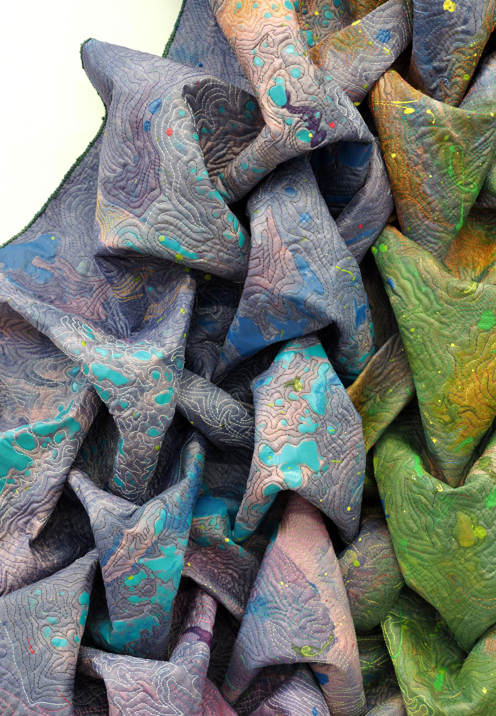 The flexibility of cloth and stitch lends itself well to creating motion and texture; organic openings shift in shape, color, and depth. This piece is part of a series capturing places dear to my heart. I spent my childhood in the dry mountains of southern New Mexico, a place where the tiniest of creeks was cause for delight. So, I well remember the urgency and excitement I felt when I got the chance to go to summer camp with a friend in Utah; a place with not only mountains and trees, but the new and wondrous experience of a lake.