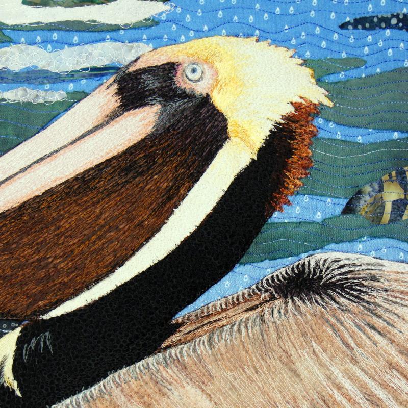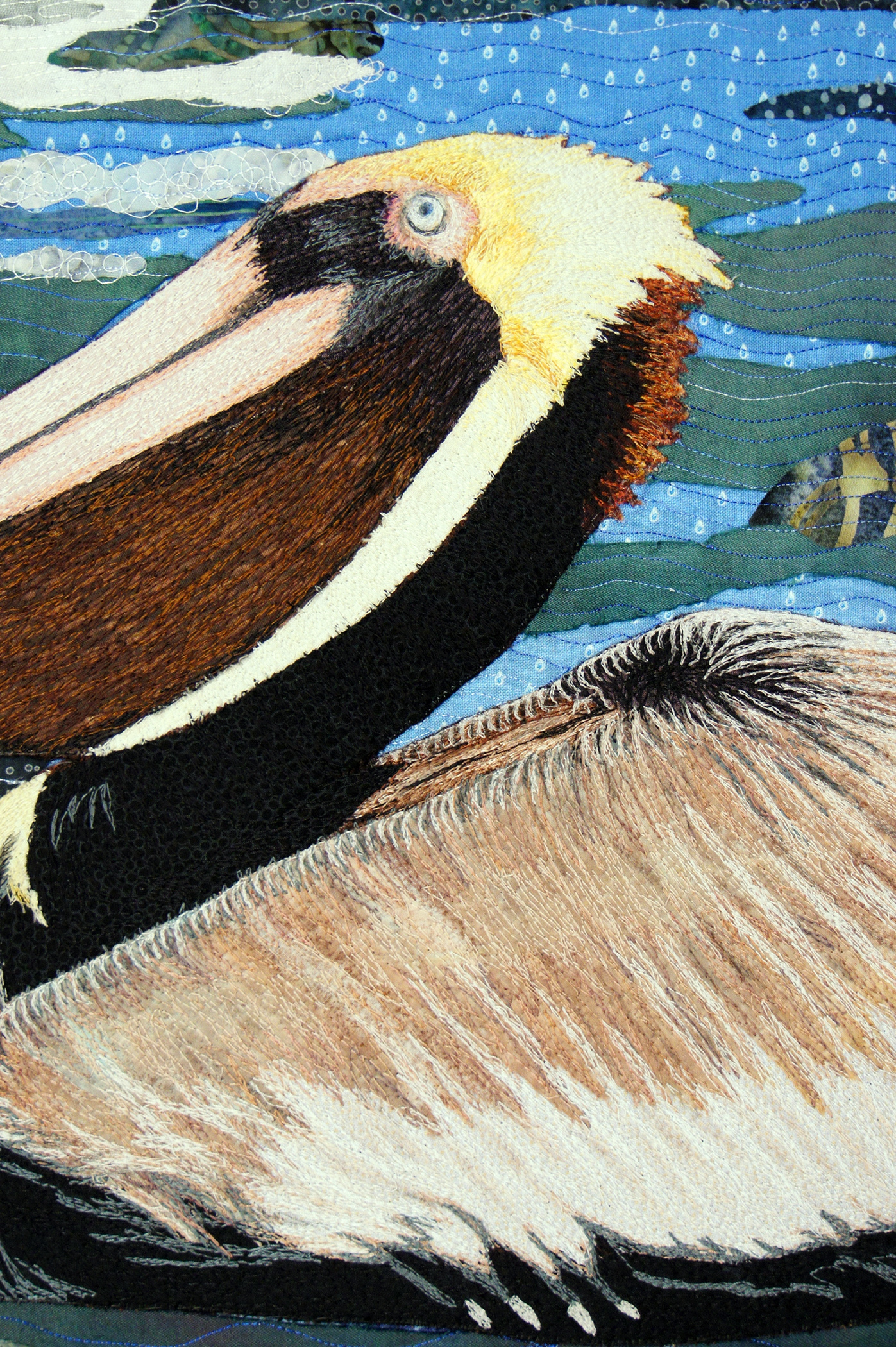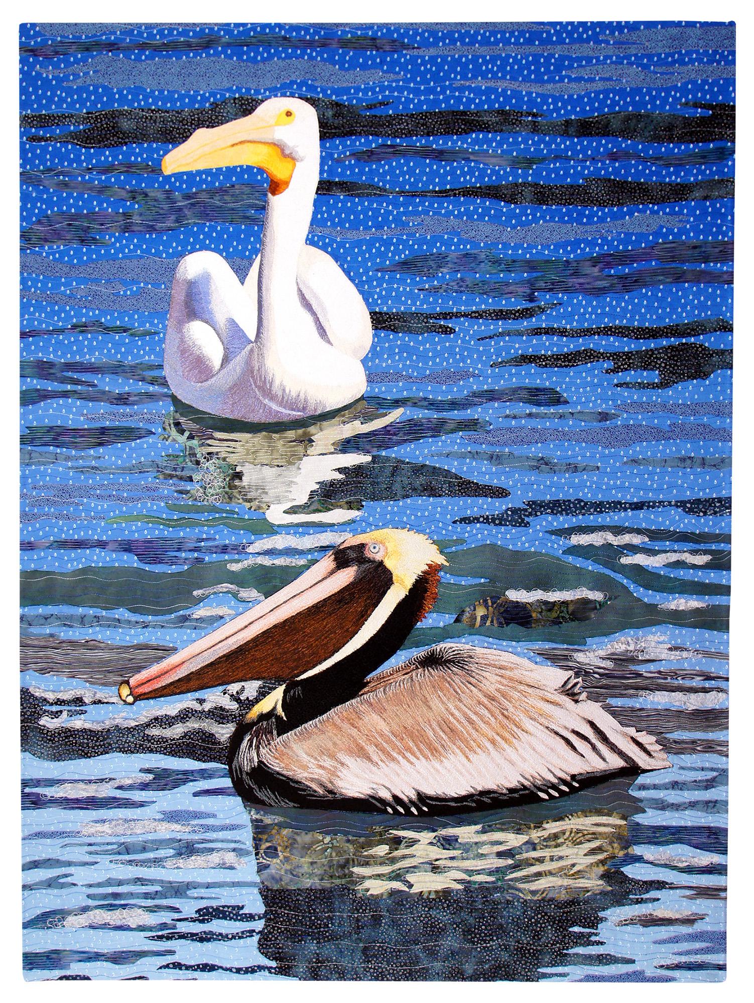 Coastal Cousins is based on my photograph of a brown and a white pelican which I spotted on a trip to the Texas Gulf Coast. White pelicans are found throughout North America’s inland and coastal waters, while brown pelicans are confined to its warmer southern coasts. Their large flocks fly in formation before settling in noisy groups on the water. Pelicans’ distinctive bills are not used to store food, but to scoop up and strain out the small fish they eat. It is amazing to watch brown pelicans plunge from on high to catch prey, or glide slowly just above the water. White pelicans tend to float on the surface while searching for their favorite fish. Brown pelicans became endangered in the 1970s due to pesticide runoff, but through conservation efforts their numbers have increased.