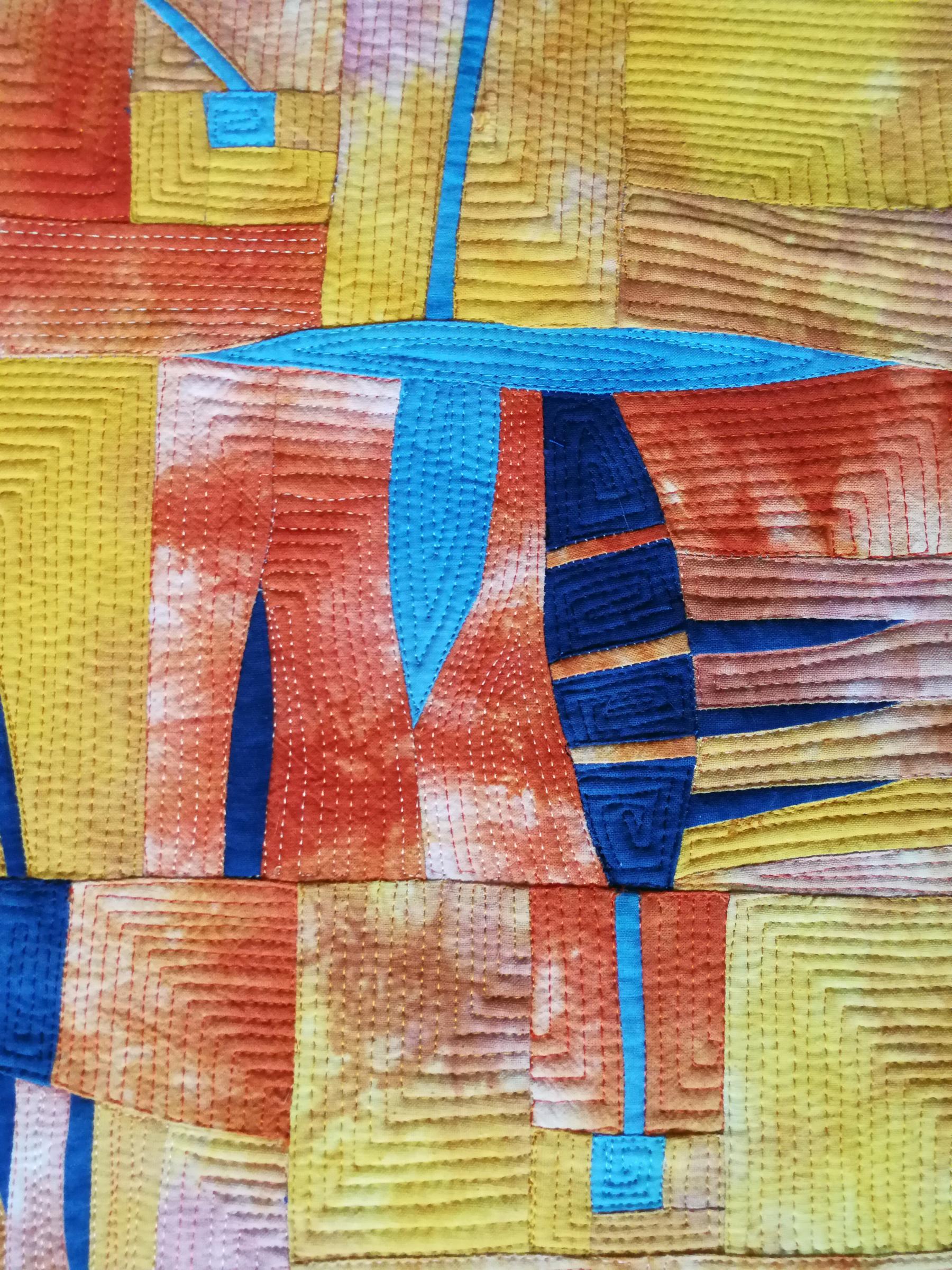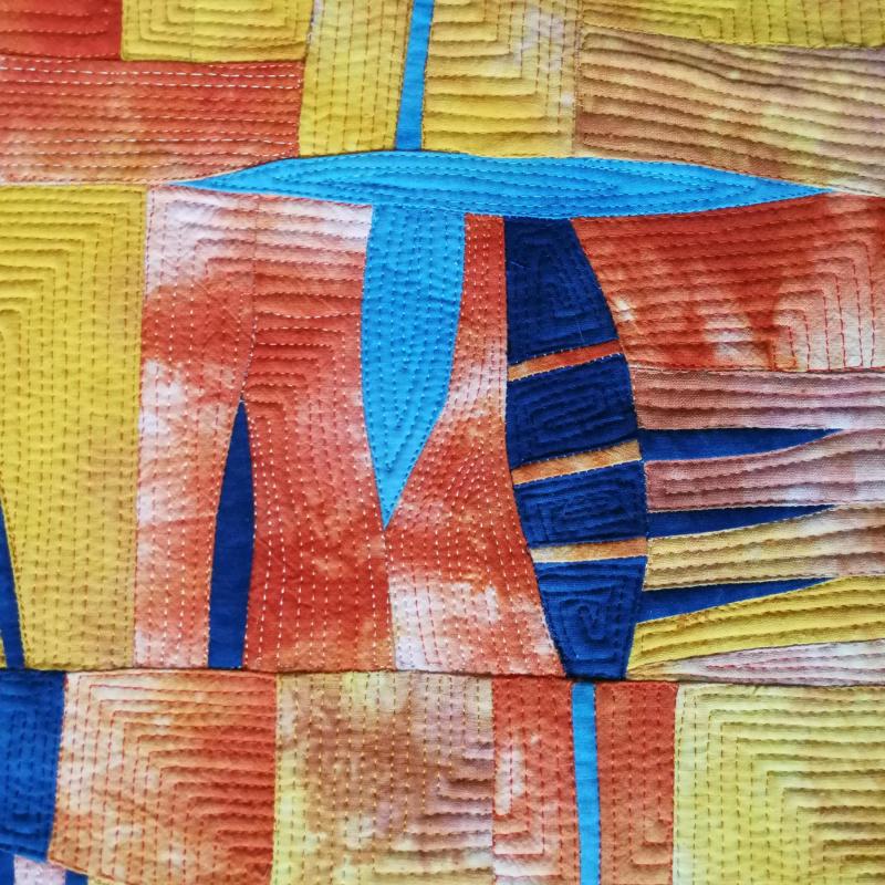 Browse the Collection Color Play Maryte Collard Size 36 in x 31.5 in (91 cm x 80 cm) Year 2023 Exhibition Abstraction: Textural Elements (SAQA Global Exhibition) Price $0.00 Buy Now >> I love how yellow, orange, and two shades of blue playfully interact in this piece. Materials Cotton Techniques Hand dyed, machine sewn, machine quilted