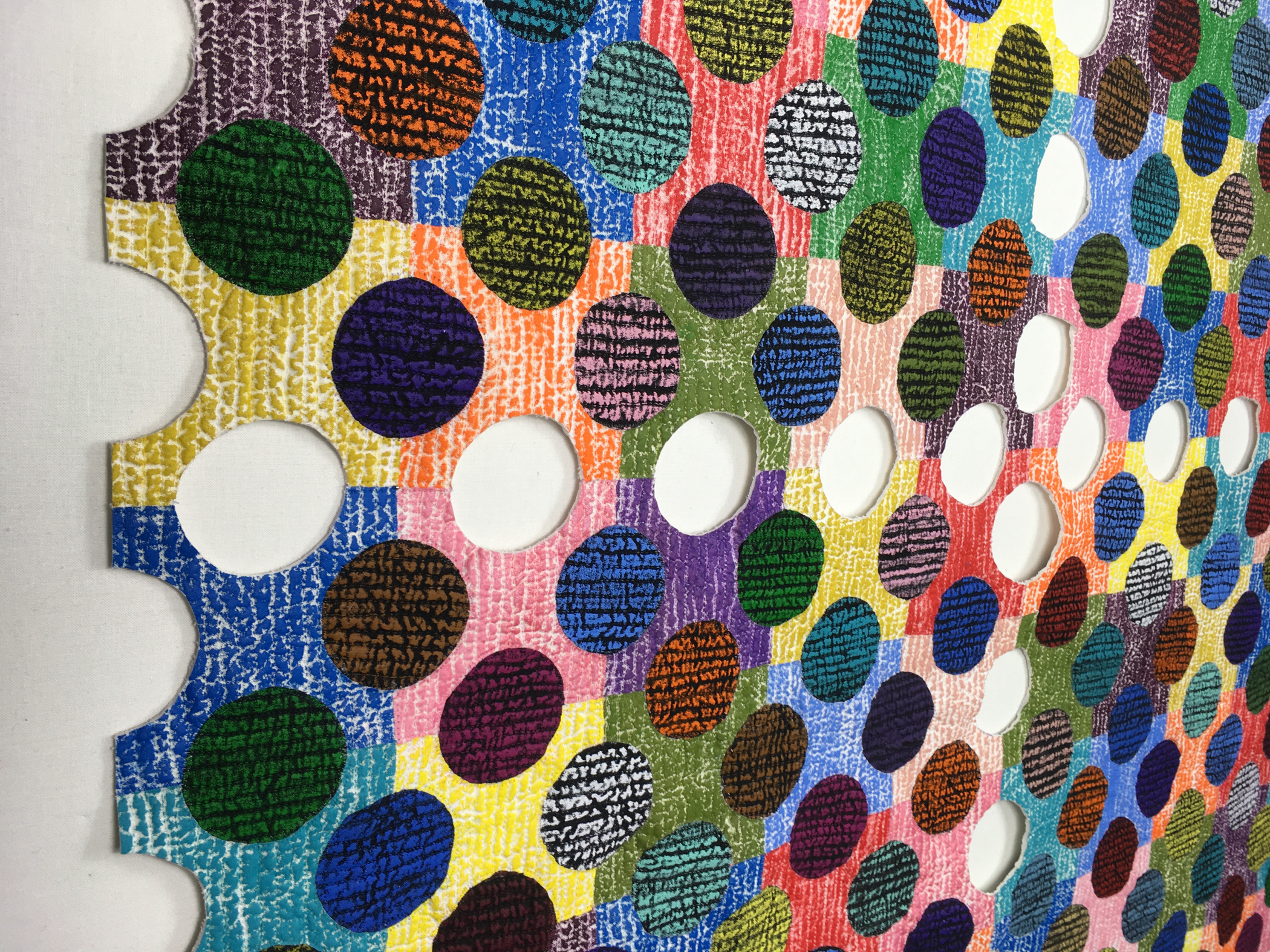 Black and white cotton, 80/20 cotton-polyester fleece, polyester and invisible nylon thread, oil pastels