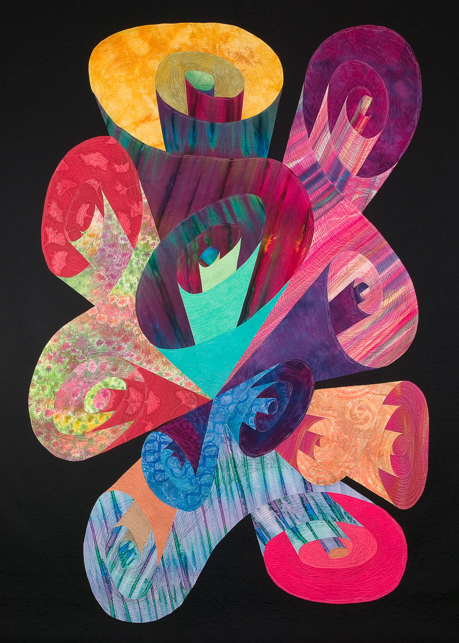 Colossal Scrolls was the first in a series of quilt designs I created with scroll shapes that look like a roll of paper with designs on both sides. Through the use of color and pattern they look as if you can reach inside them. This quilt was created and finished in 2002.
