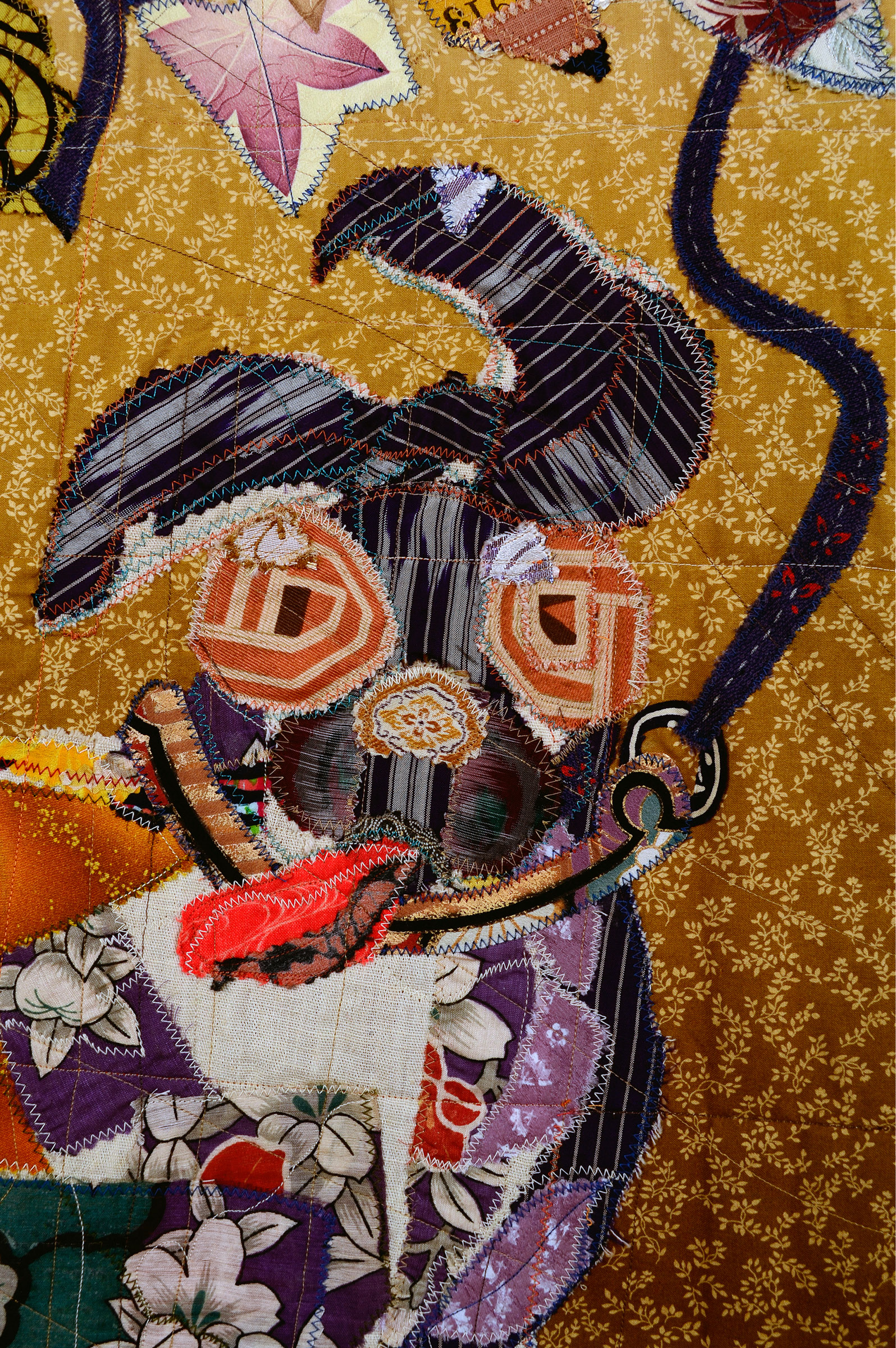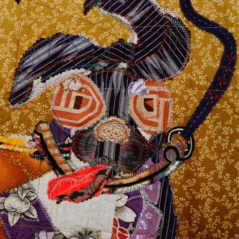 This piece began with no plan, no sketches, just free- cutting cloth until it released the image. Yellow Bali cloth starts to become a coat. Suddenly, the arms, hands, and face are all there in that one cutting process. Add/ subtract until the art reaches level at 0.