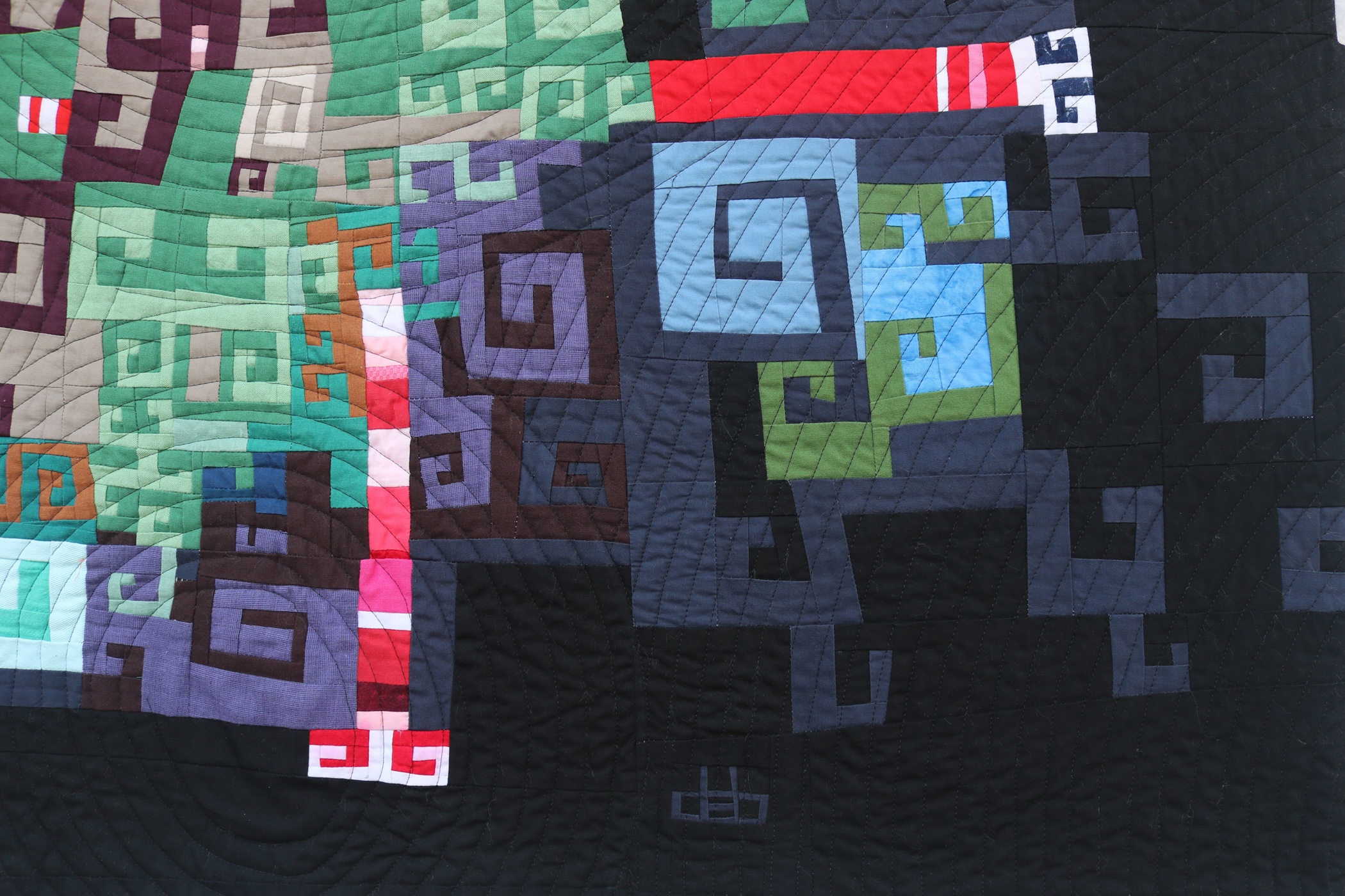 Connecting fabric. Connecting people. Connecting my art. These are but a few of the connections I’m communicating in this art quilt created from spare parts from other quilts. Connections is also a tribute to the connections I’ve made with art quilters across the globe via the Internet and satellites. Also, over the past several years, my creative journey has revolved around the idea of connecting discrete units to craft a harmonious whole.