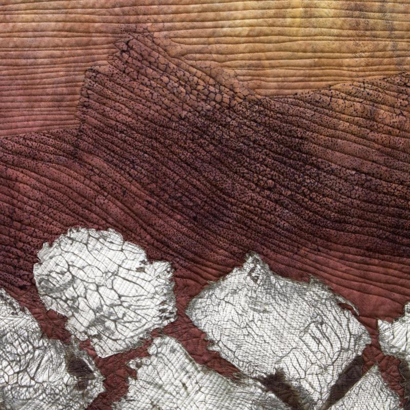 Hand printed and painted with dye, corn and potato dextrin resists, machine raw edge assembly, machine quilted.