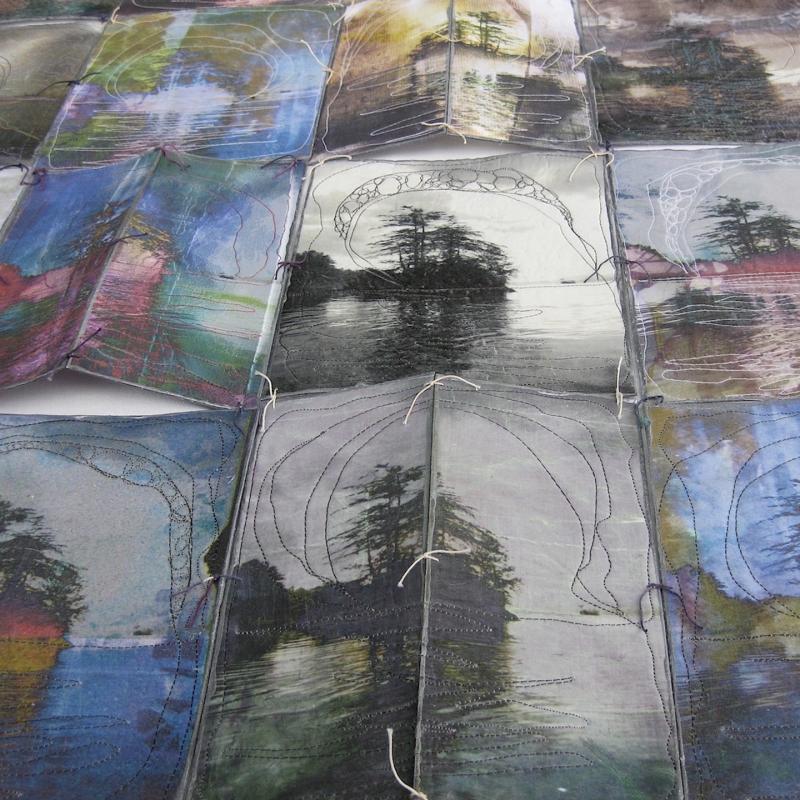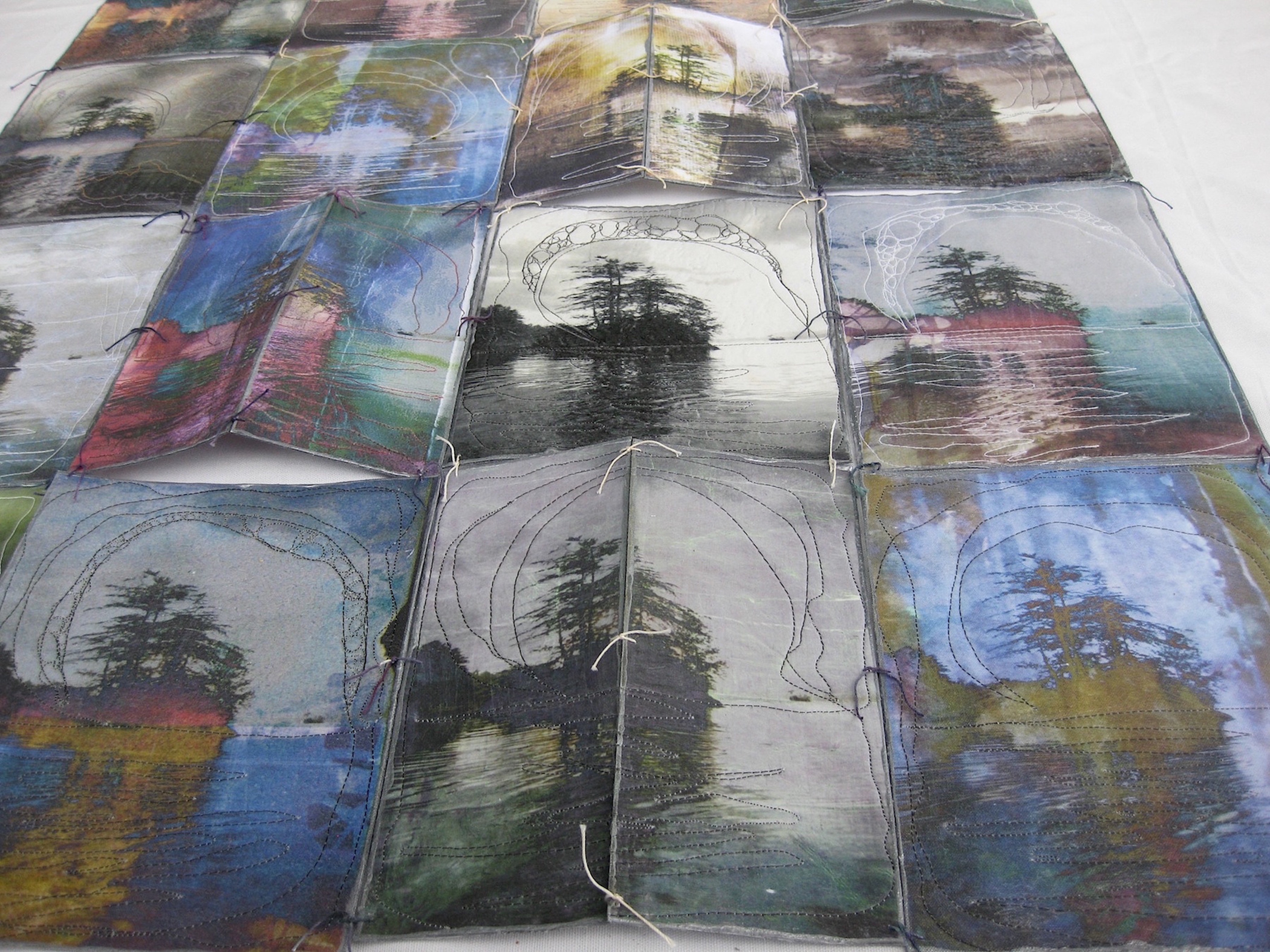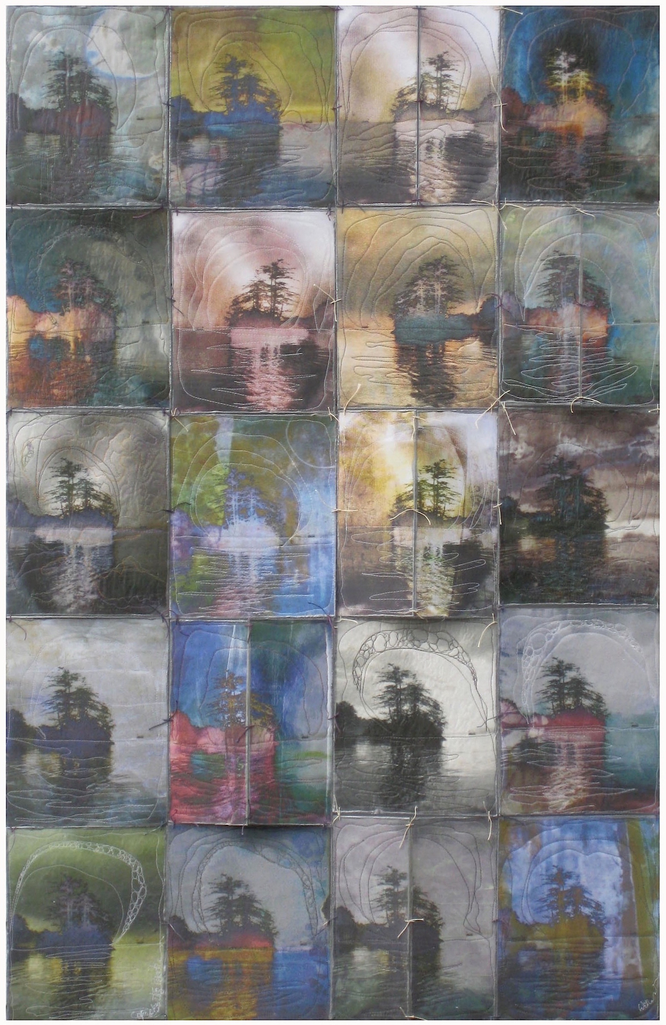Spending time in nature is a large part of my art making. It takes me on a journey inside, when I’m outside. The same image was developed via image editing with different images of painted fabrics. The result symbolizes the weather’s changes and the different moods that project from my mind.