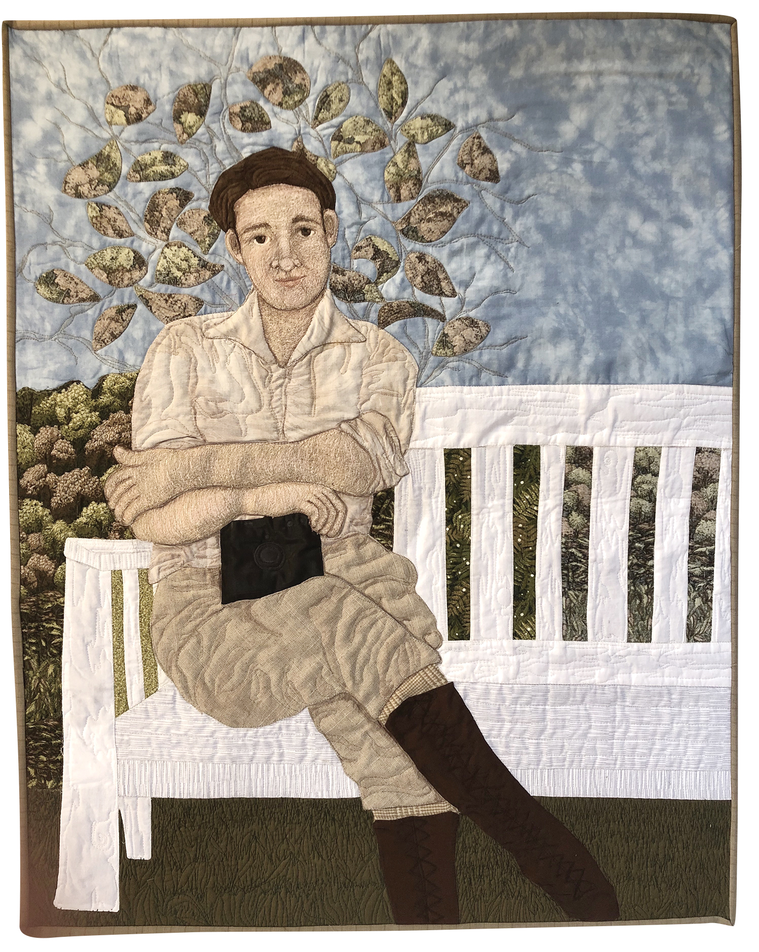 Through hand and machine appliqué and careful fabric selection, The Correspondent’s personality, his surroundings and a sense of time and place emerged. For each part of his face and figure, intense, free-motion machine stitching was used to create detailed appliqués. These pieces, were then appliquéd to the previously stitched background. The layers of appliqué and thread give his portrait dimension, texture, and personality.