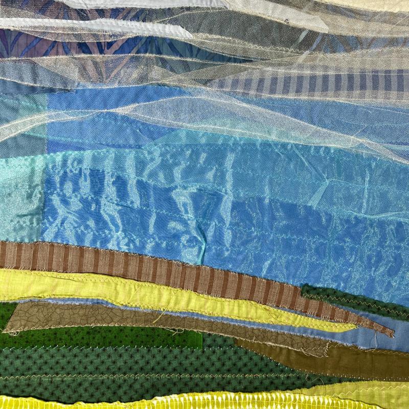 I walk in nature every morning. When I hit the trail my mind relaxes listening to the bird calls, and seeing the subtle changes around me. My creative energy depends on this morning ritual. Coyote Hills Park is based on a favorite walk that skirts San Francisco Bay. The foreground is woven from print fabrics that reflect the textures and colors of the marsh. Fog often flows over the hills even as sun reflects off of the water's surface.