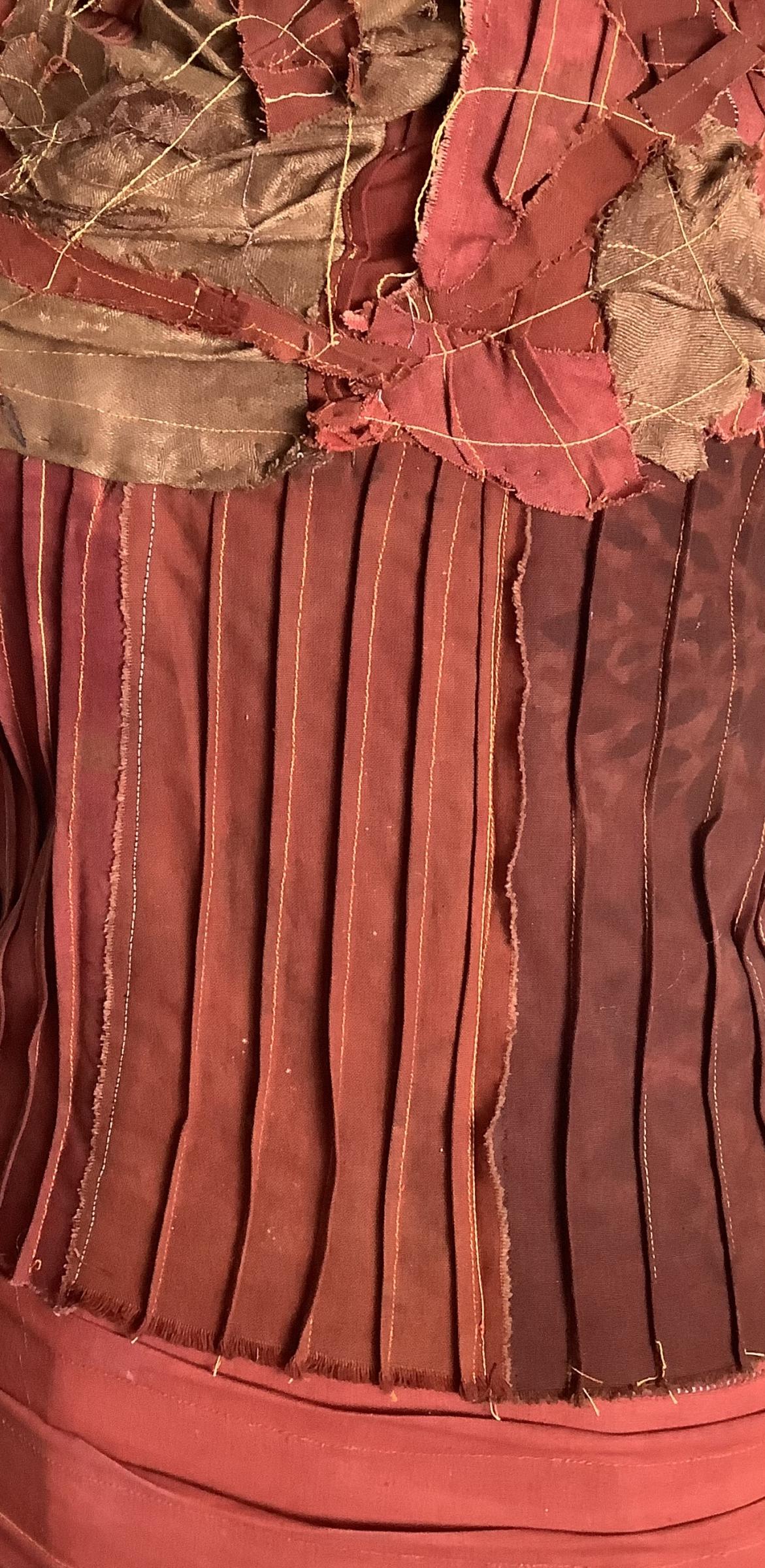 Naturally dyed with madder root (Turkey red oil), pleated, eco-printed, and sewn from up-cycled linens into a true-to-form, layered corset.