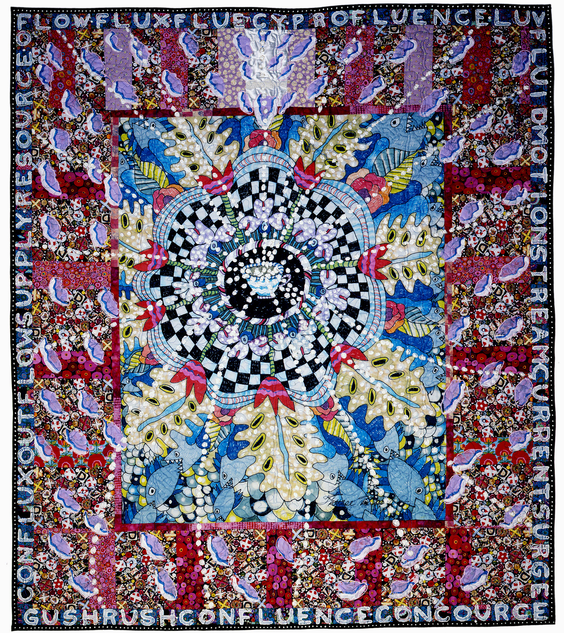 By the year 2000, I had many many drawings waiting to be made into quilts. My hands were getting tired from all of the cutting and sewing. I still had hundreds of images in my head waiting to be drawn. But now I found out about printing digital pictures onto fabric, which opened up possibilities I had never before imagined! Cup Mandala began with one of my drawings professionally printed onto fabric. I made it into a quilt and painted messages about the idea of flow and movement onto the surface. I still love to play with fabric printed with my own designs.