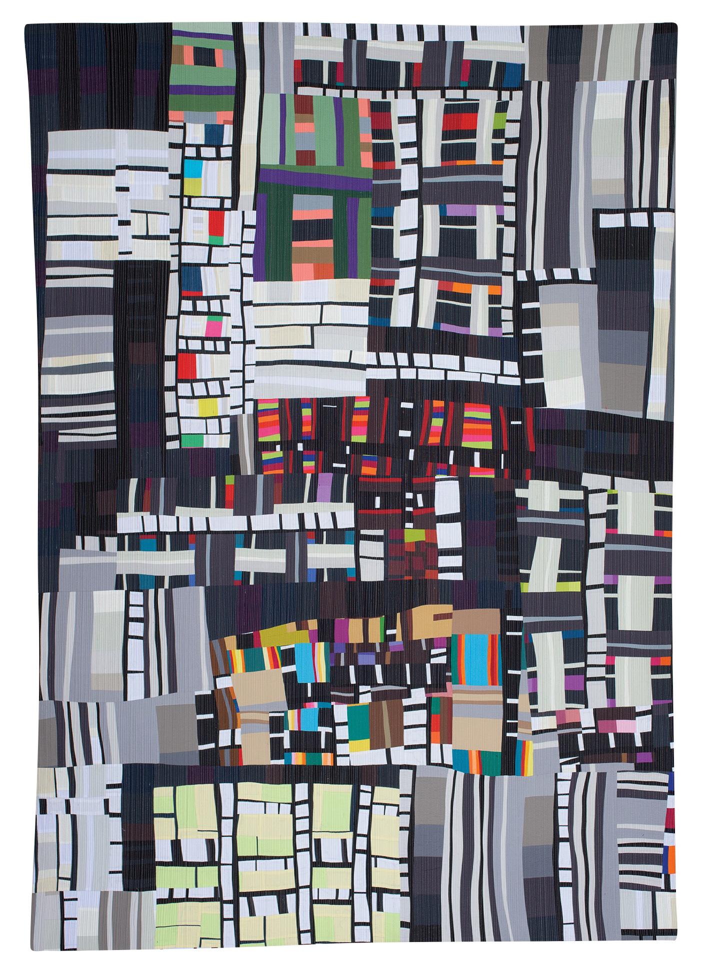 I am an improvisational textile artist. The rhythm and repetition of piecing fabric, of cutting into those pieces to create new configurations and rejoining them--without ruler or measurement--create vigorous, abstract figures. Bold color and value choices further propel the musicality of my compositions. The works are densely quilted, flattening the images into dynamic fabric paintings.