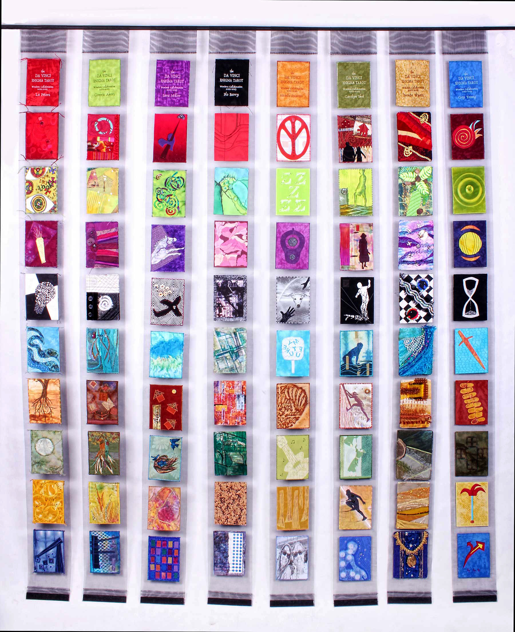 A rescued deck of tarot cards printed with the drawings of Leonardo da Vinci became inspiration for the collaboration of eight North Texas quilters and fiber artists. They drew cards from the deck and used the Leonardo drawings as prompts for a challenge, each choosing a color to be explored in a given month. Working with favorite materials and techniques, the artists created 5" x 7" art-quilt cards probing the diverse themes of the cards in the deck. The final quilt-like assemblage of three-layer cards mounted on screening has been shown in quilt shows and furthers dialogue on the question "What is a quilt?"