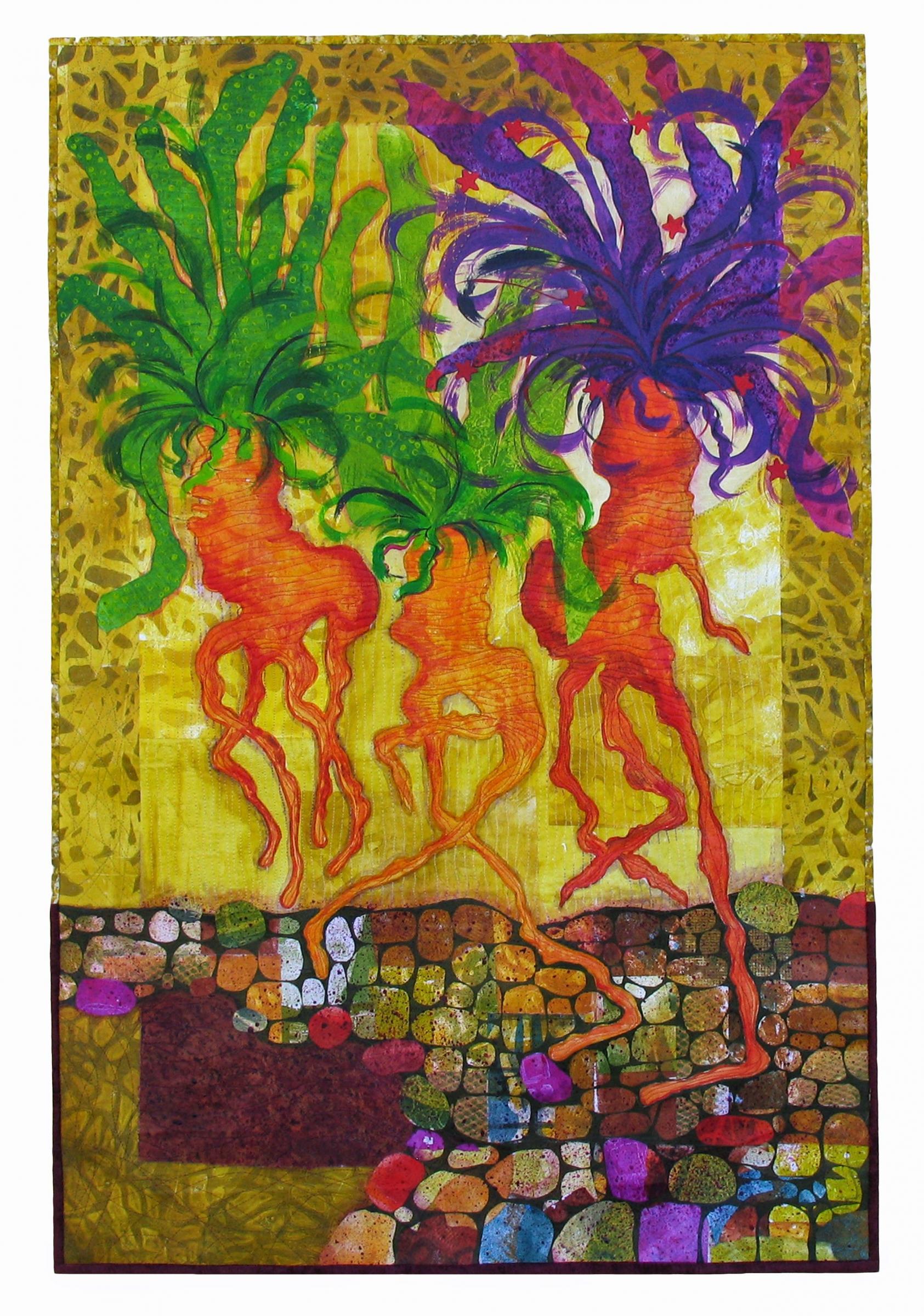 When first pulled from the garden, these quirky, misshapen carrots filled me with delight. They made me laugh. They’d had a rough time underground—hitting, then growing around rocks and roots—and their bodies showed it! They reminded me of the tough, resilient women I know, whose bodies have been changed by disease or its treatments. Like them, these three spunky characters want to celebrate that they made it. It’s girls’ night out — let’s dance!