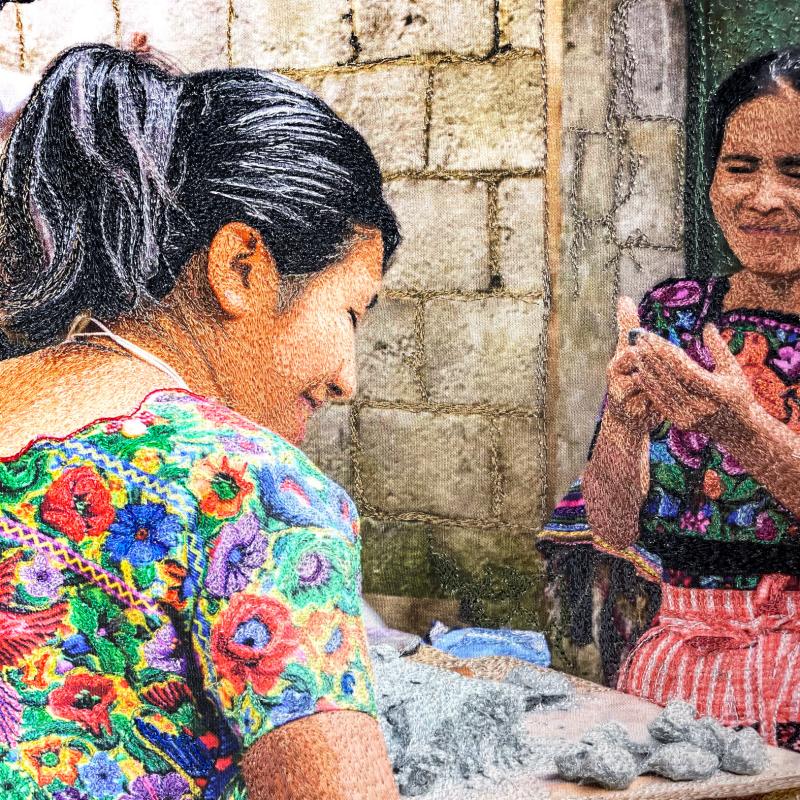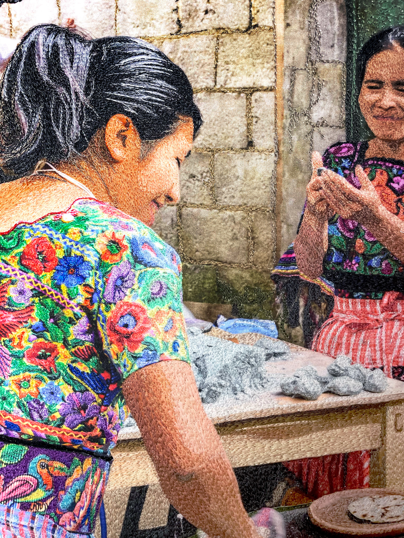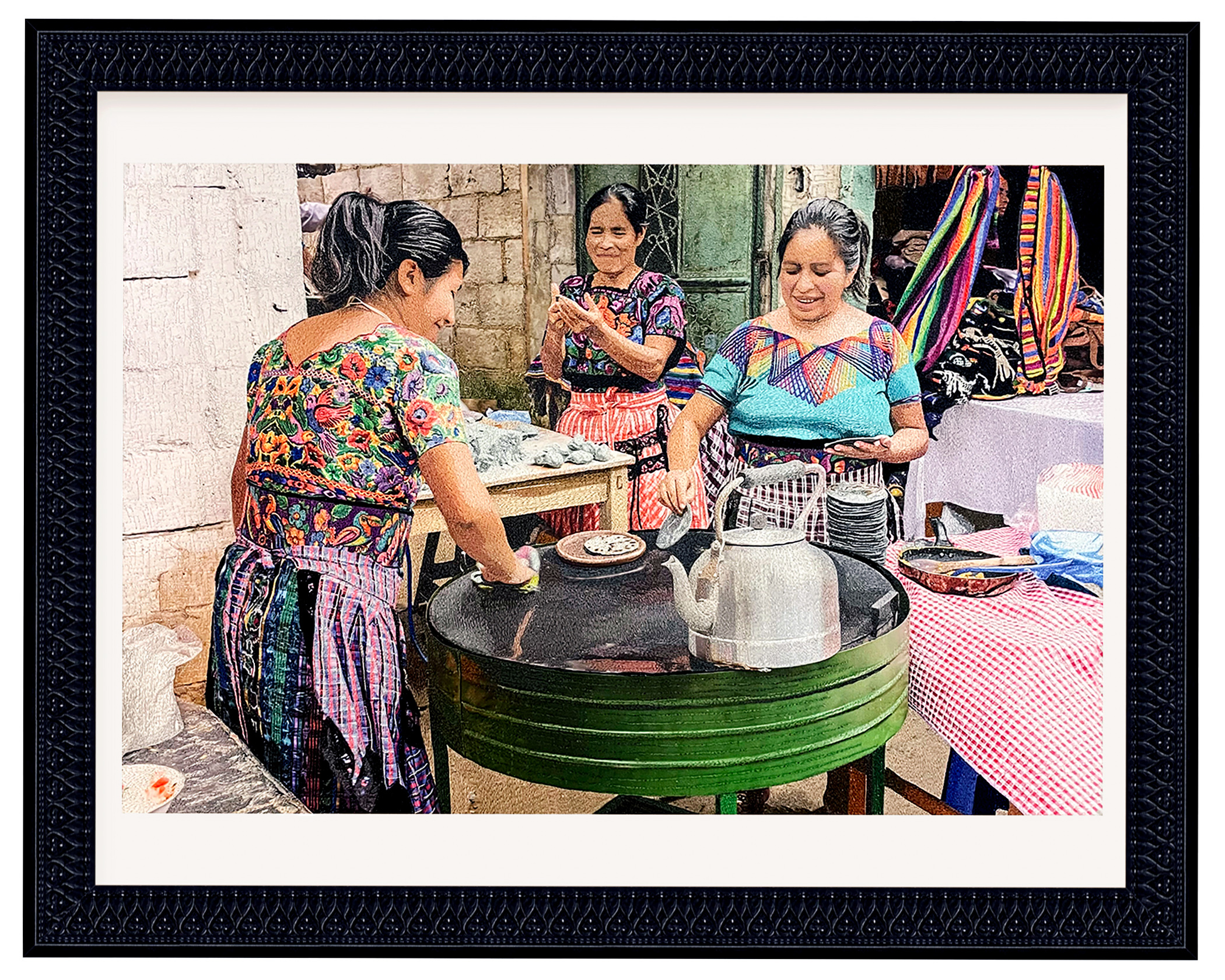 The title De Colores is a tribute to the Guatemalan women dressed in their native finery. They are in a market on the plaza, cooking food on top of a barrel cut into thirds. A propane hose in a blue tube feeds the flame to light logs under a steel cooktop. They are very busy on a Saturday afternoon preparing traditional blue corn tortillas. Before going to work that day to make food for the village, they enjoyed a breakfast of eggs cooked in a copper skillet. The reflection of an arm is seen on the steel cooktop, and a face peeking from around the corner adds mystery to the scene.