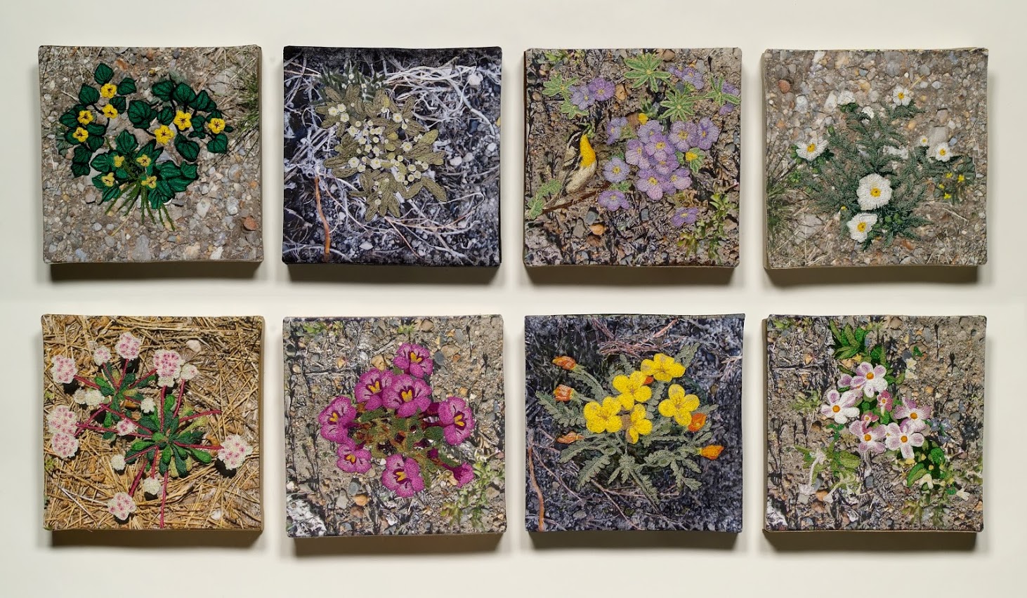 I took pictures of these wild flowers while on a bird watching tour of the eastern Sierras in Nevada and California. To see the tiny flowers that had been printed on the fabric, clearly, I enlarged them while doing the embroidery and appliqued them to their original background. There are eight 8 by 8 inch quilts mounted on 8 by 8 inch cradled boards so they stand out a bit from the wall when hung.