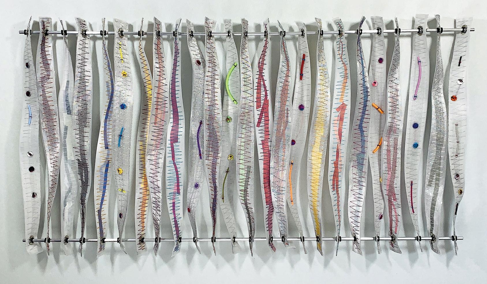 I employ a sewing machine and techniques to create innovative, dimensional constructed fabric sculptures. Non-traditional items are also used such as wire mesh fabric, grommets, mylar, metal rods, metal tubing rubber o-rings and rubber tubing.