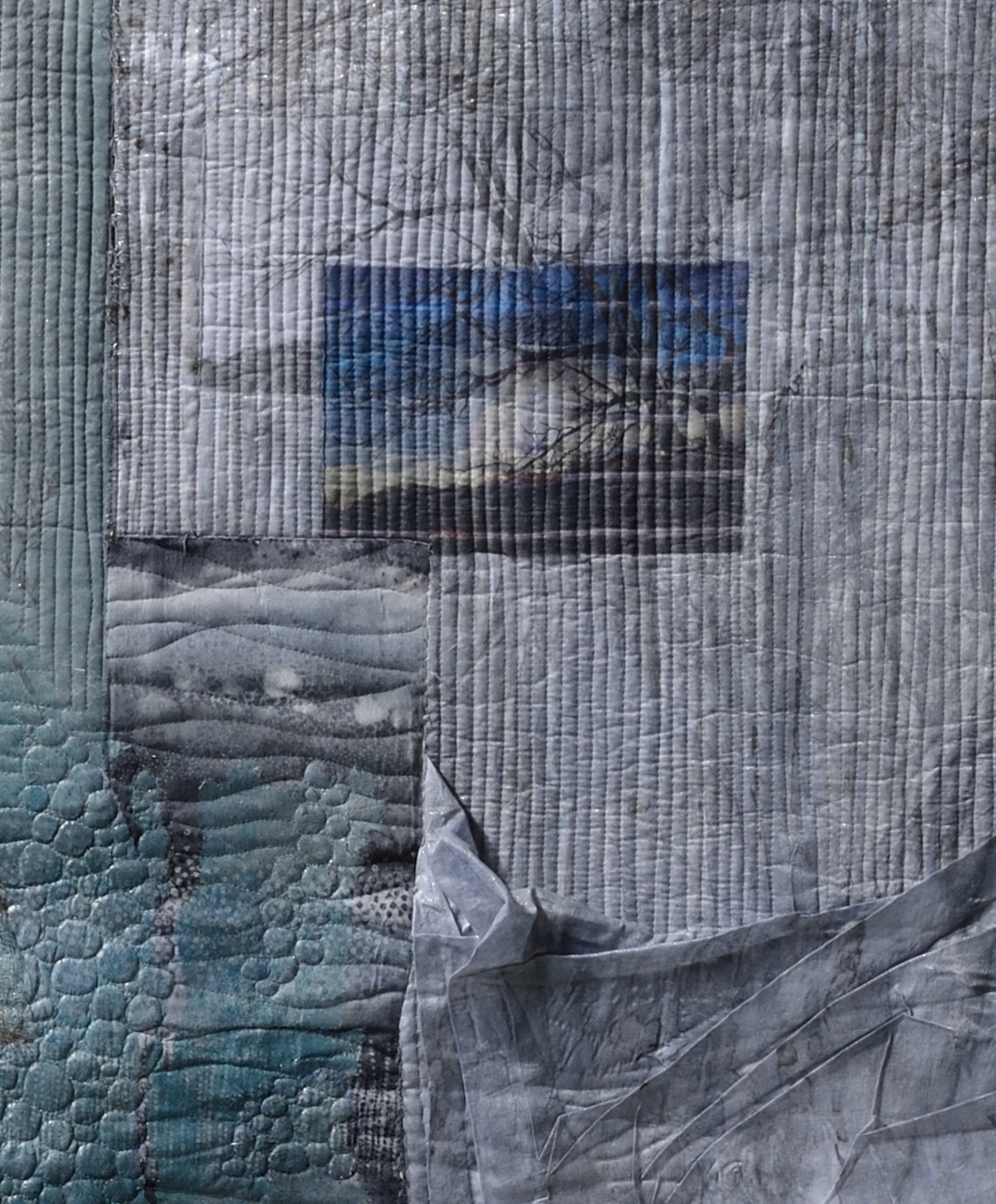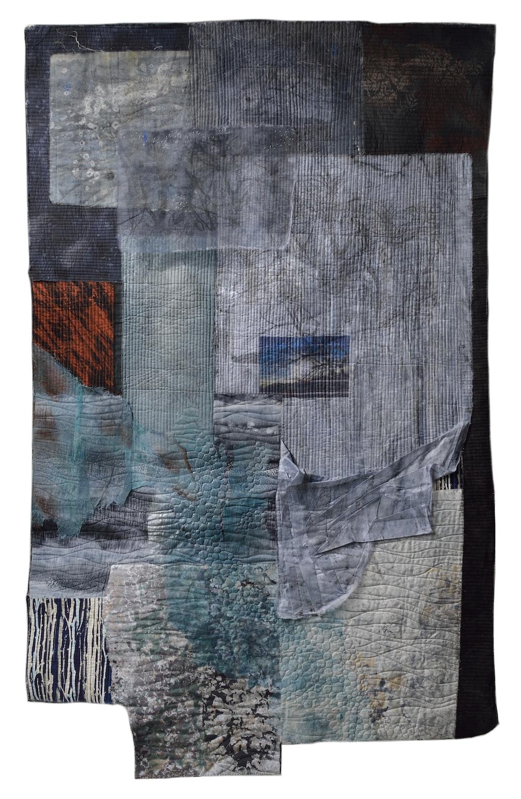 Pieced, collaged, machine quilted, painted, dyed, discharged, transferred, printed