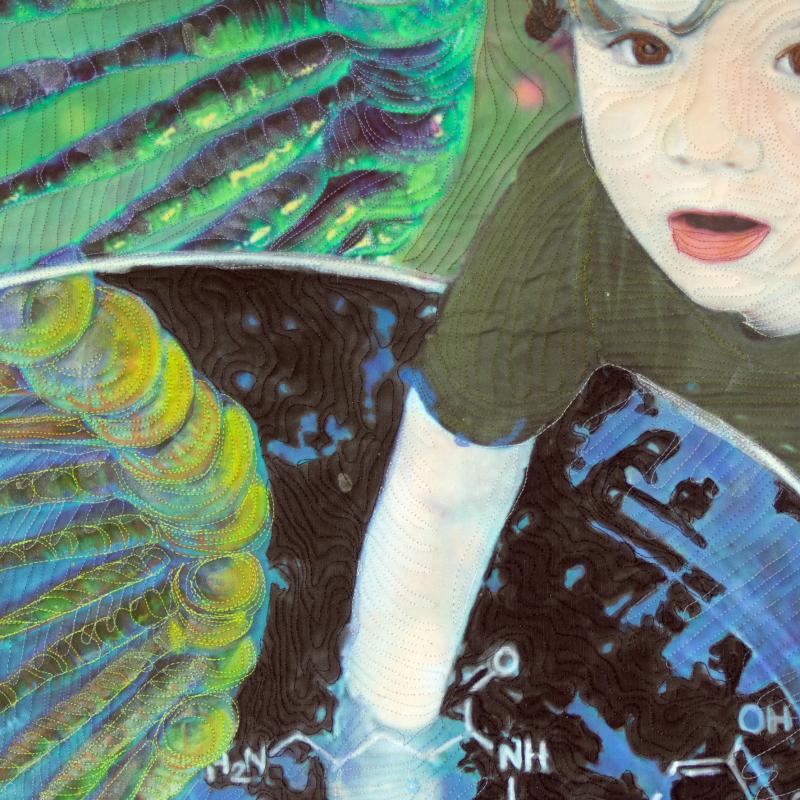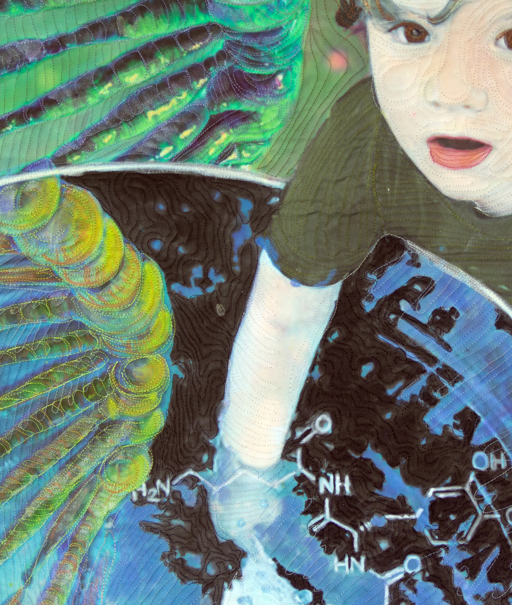 Printed, free motion quilted, painted with acrylics, pigment sticks, liquid watercolor, and other mediums
