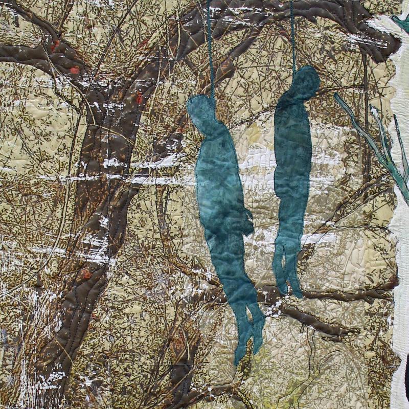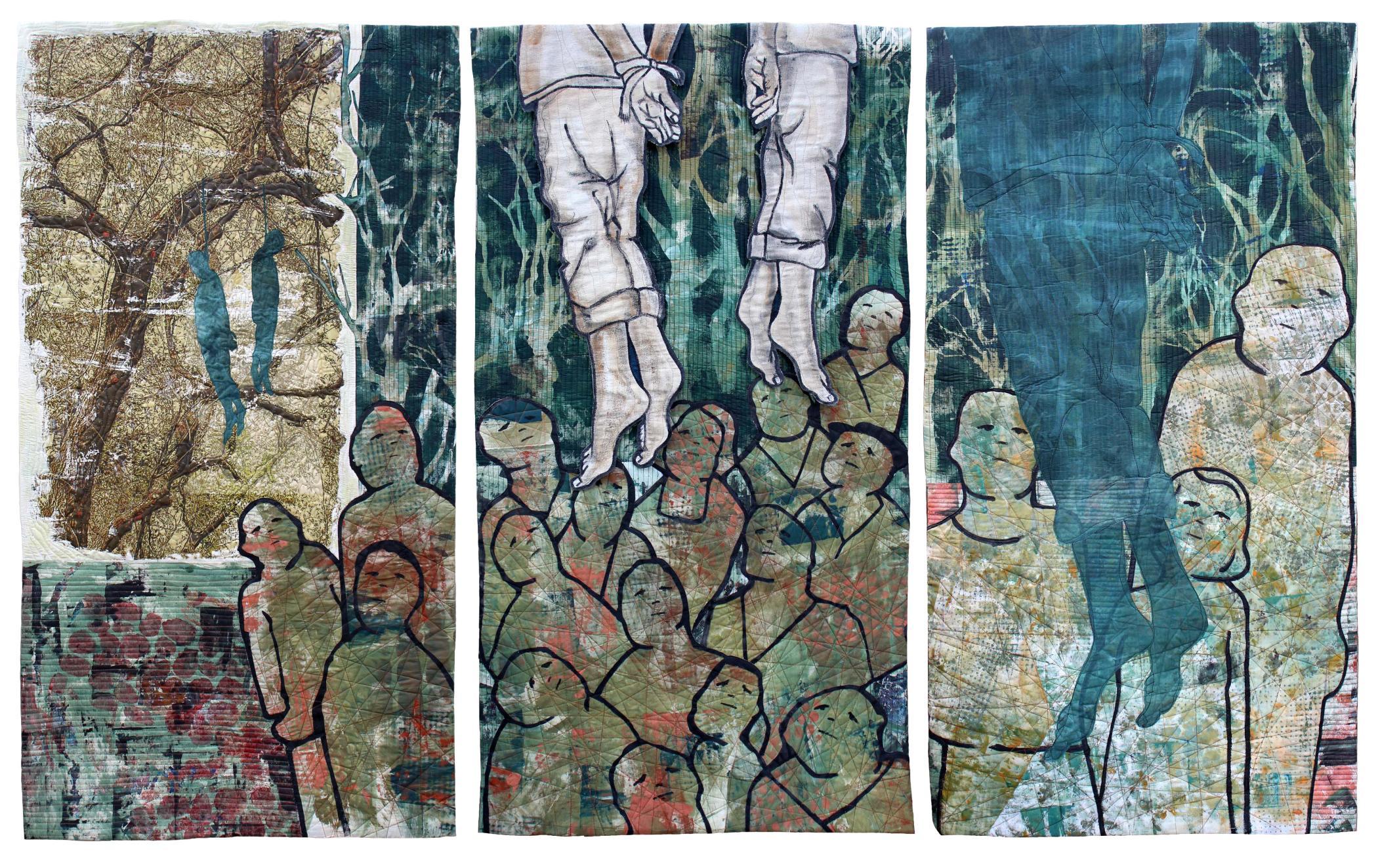 My understanding of public murder has grown and deepened. In Art Spiegelman’s graphic novel, Maus, Holocaust survivor Vladek Spiegelman remembers: “The Germans intend to make examples of them… They hanged there for one full week. I did not want to go outside to pass where they were hanging.” Each public murder victimized both an individual and a community. Such control-by-targeted-brutality crosses cultures and years. It also characterized America’s Jim Crow South. Those in power printed postcards of Black lynching victims. Whole communities were terrorized. Who might be next? I chose to depict both the murdered and the ones who had to look. Remembering, we should not look away.
