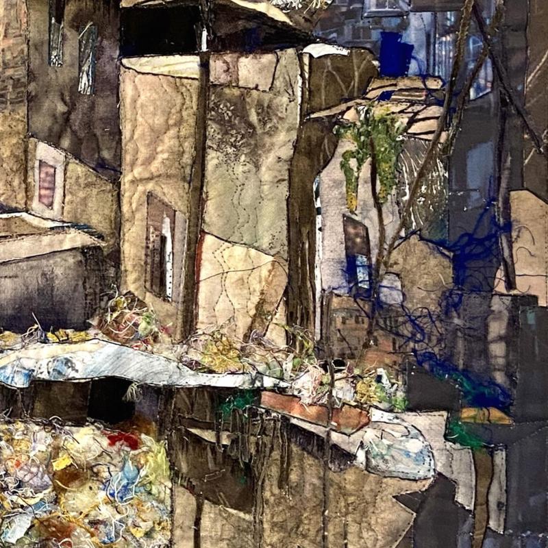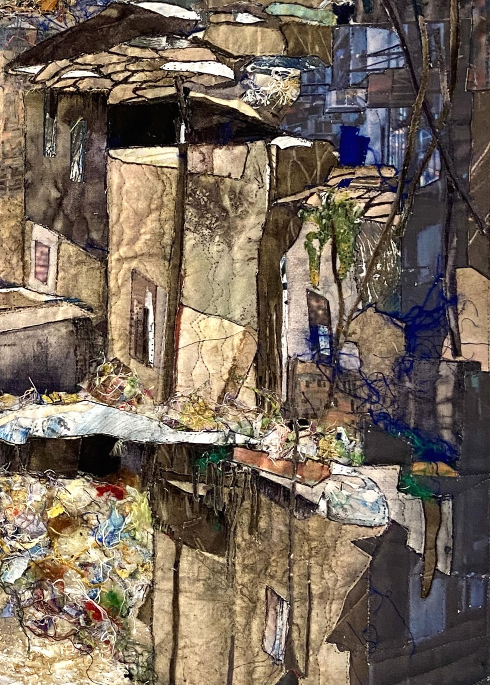 Various fabrics, plastic, packaging bags, sewing scraps, haberdashery, ecoprints, acrylic paint, Liquitex mediums, white opaque flakes, string gel, natural sand gel, water soluble foundation