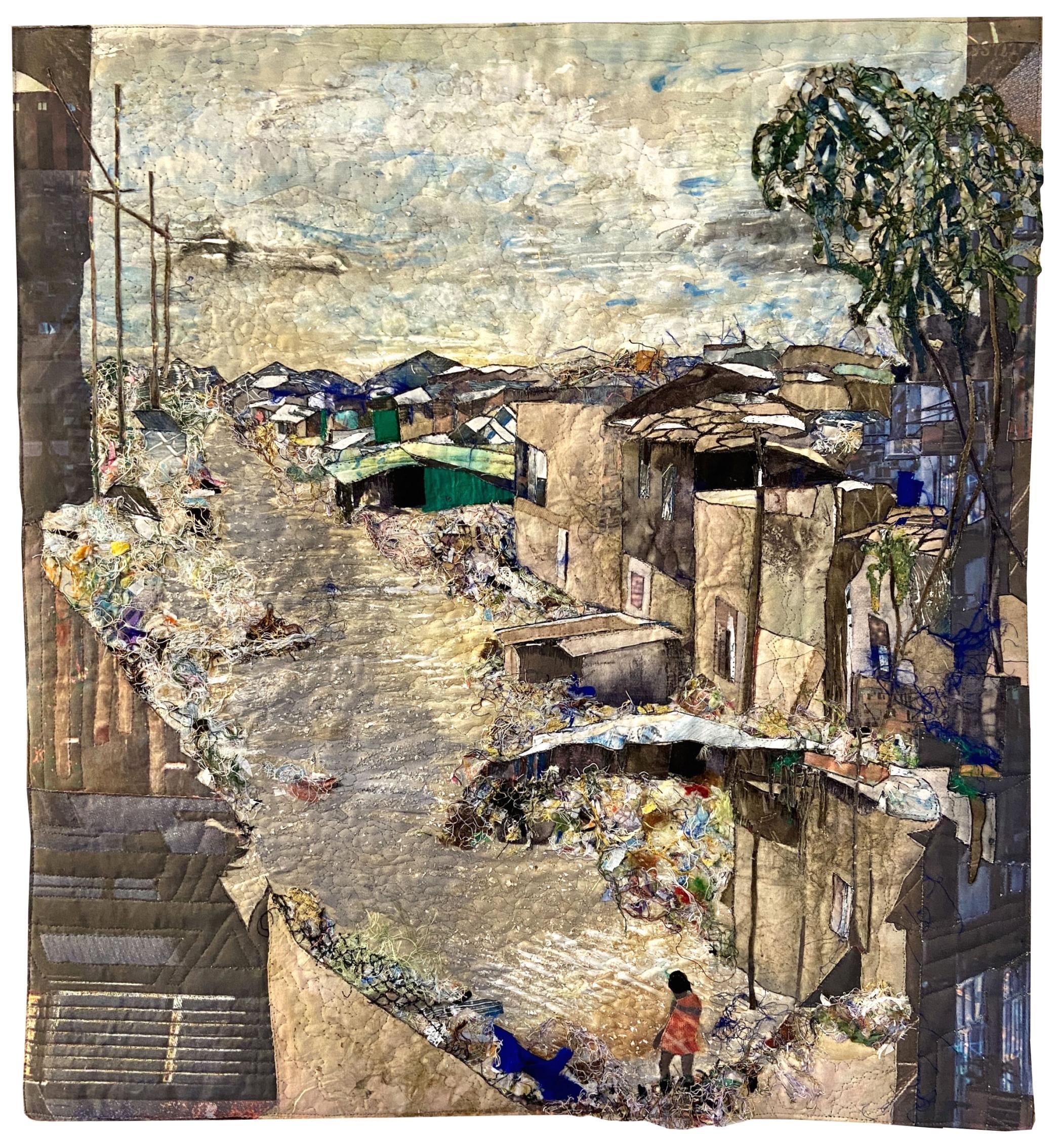 It's a desolate landscape, with dilapidated houses, polluted water, and garbage everywhere. A child sadly contemplates this disastrous environment where he has to sort out the rubbish for his survival. But if you look from a distance, you can see a serious face against this background, like the living conscience of the place: let's not forget, let's not close our eyes to the misery that hides behind our consumer society.