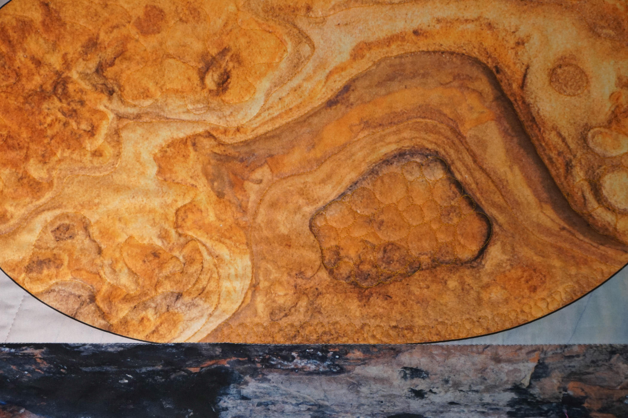 In this piece I have combined images of rocks from the desert of the Southwest, some darkened by the soot of fires from indigenous people from long ago, to construct my composition. Through the use of the computer, I have sliced and diced these images into geometric shapes and then pieced them together to form my own creation, one that allows the viewer a new way to connect with nature’s complexity.
