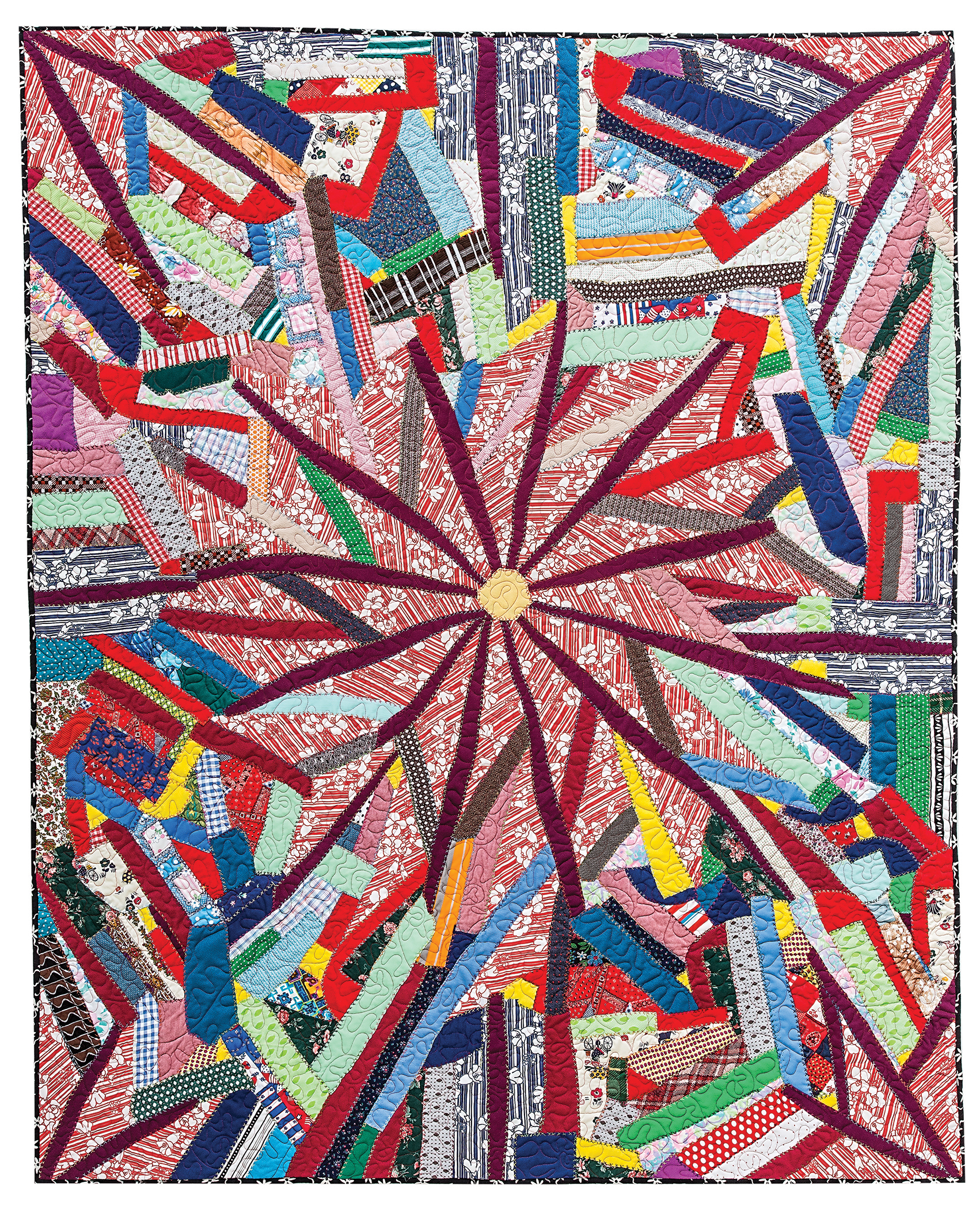 This is a quilt made by My grandmother, Elda Wolfe. She was quite prolific in scrap polyester quilt making in the 70's and 80's. She struggled with severe arthritis, and which her hands, fingers, arms didn't bend, but she never stopped creating. This quilt, Double knit flowers was a such a break through piece for her. Knowing that she worked with a sheet draped in her lap, and working from the center out, is inspiring in itself. No design walls to plan anything, yet we see exactly what she was thinking, as the blooms continue out into the corners. Her daughters cut all the clothing apart fo her to to use into random pieces, as she could not use a scissors, and then she puzzled al the pieces together to make these modern beautiful quilts.~ Victoria Findlay Wolfe
